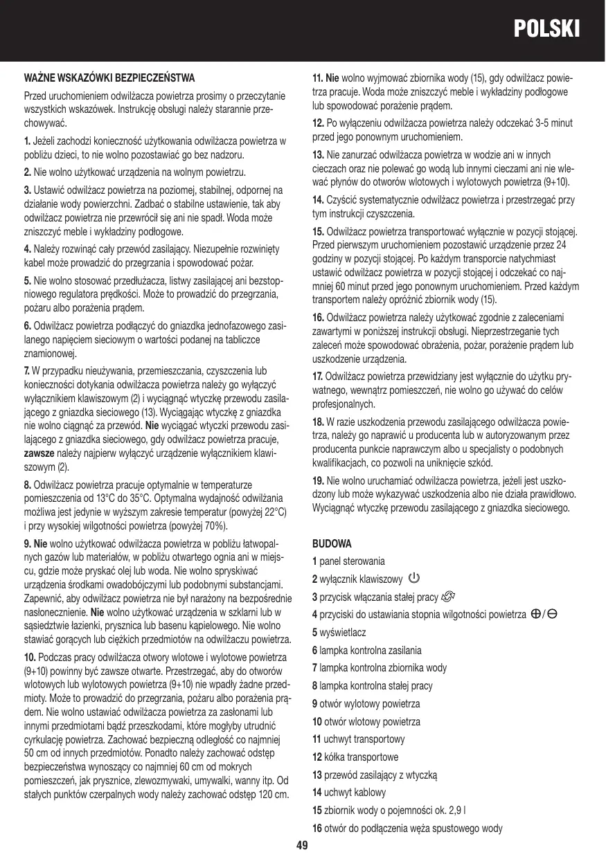 16. N'utilisez le déshumidificateur d'air que conformément aux instructions du présent mode d'emploi. Le non respect de ces instructions peut provoquer des blessures, un incendie ou une électrocution. L’appareil peut également