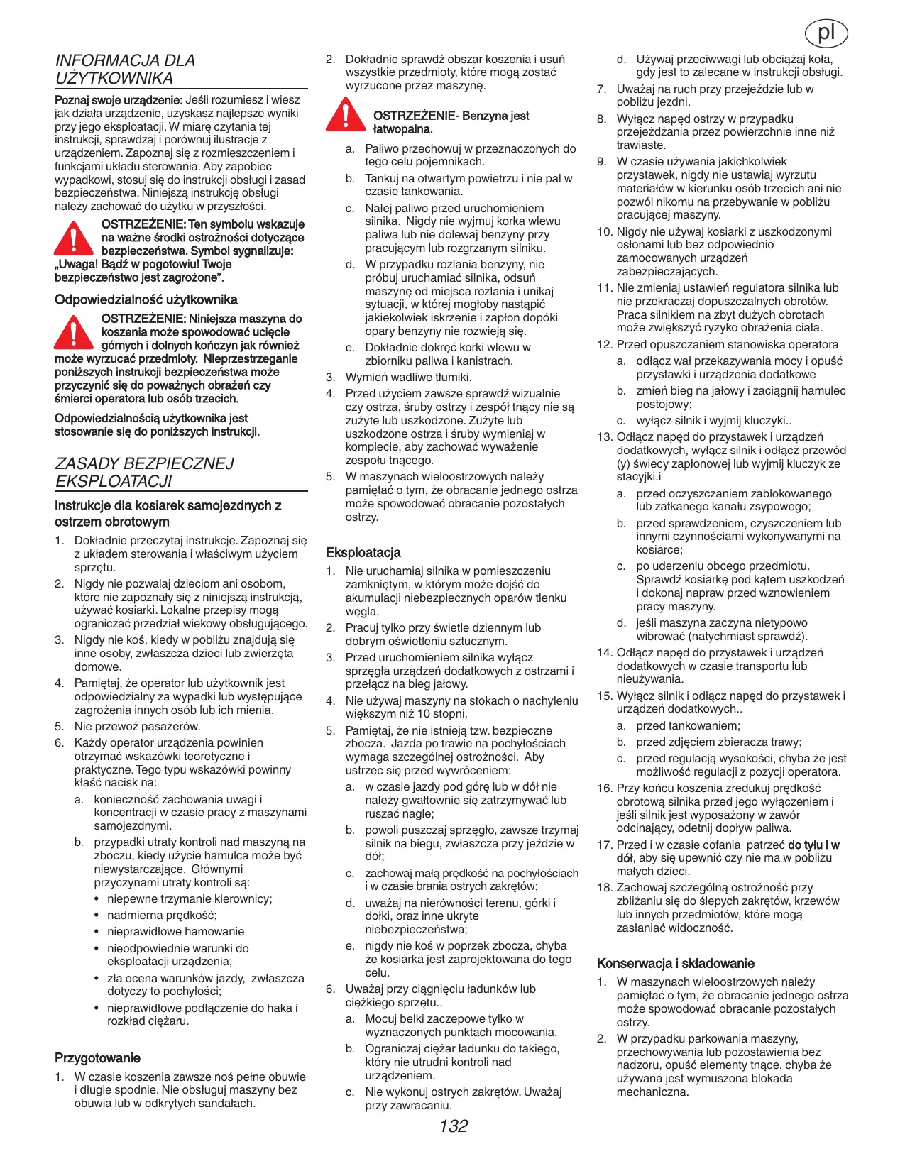 Garder à l’esprit que l’opérateur ou l’utilisateur est tenu responsable des risques ou accidents arrivés aux autres personnes ou à leurs biens. Ne pas prendre de passagers. Tous les conducteurs devraient recevoir des conseils théoriques et pratiques. Ces conseils sont : a. la nécessité d’être soigneux et attentif lors de la tonte sur tondeuse autoportée b. la reprise de contrôle de la tondeuse en pente est impossible par les freins. La perte de contrôle s’explique de la manière suivante : O prise de la roue insuffisante; O conduite trop rapide; O freinage inadéquat O le type de machine ne convenant pas à la tâche; O manque d’attention sur les conséquences de tontes en pente, en particulier; O mauvais accrochage ou répartition inégale de l’herbe dans le sac.