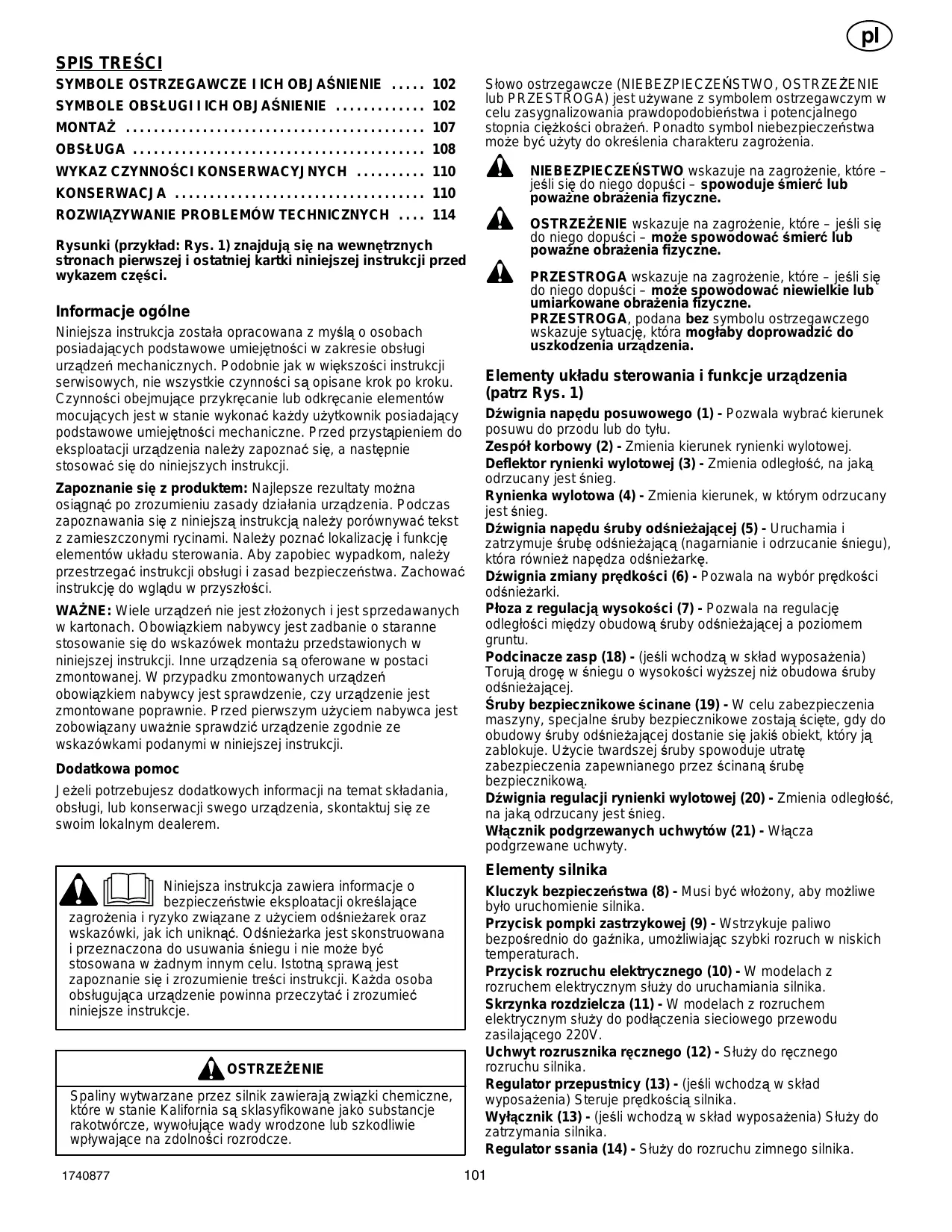 1. Inspectez complètement la zone de traitement et enlevez les paillassons, les luges, les planches, les câbles et tous les autres objets étrangers à l’équipement. 2. Débrayez tous les embrayages et mettez au point mort avant de démarrer la machine (moteur). 3. N’utilisez jamais l’équipement sans porter une tenue d’hiver appropriée. Portez des bottes qui résistent aux surfaces glissantes. Evitez de porter des vêtements larges qui pourraient se prendre dans des pièces mobiles. 4. Manipulez l’essence avec précaution, elle est hautement inflammable. a. Utilisez un récipient à essence homologué. b. N’ajoutez jamais d’essence dans un moteur chaud ou en marche. c. Remplissez le réservoir d’essence avec une extrême précaution à l’extérieur. Ne remplissez jamais le réservoir d’essence à l’intérieur. Revissez le bouchon du réservoir à fond et essuyez l’essence répandue. d. Ne remplissez jamais des récipients à l’intérieur d’un véhicule, d’un camion ou d’une remorque avec une bâche en plastique. Placez toujours les récipients sur le sol, loin des véhicules, avant de les remplir. e. Si cela est plus pratique, enlevez les appareils fonctionnant à l’essence du camion ou de la remorque et remplissez−les à même le sol. Si ce n’est pas possible, alors remplissez avec un récipient portable plutôt qu’à partir du gicleur du distributeur de carburant. f. Maintenez le gicleur en contact avec le bord du réservoir de carburant ou l’ouverture du récipient jusqu’à ce que le remplissage soit complet. N’utilisez pas un outil de fermeture/ouverture de gicleur. g. Revissez le bouchon du réservoir à fond et essuyez l’essence répandue. h. Si de l’essence s’est répandue sur les vêtements, changez−les immédiatement. 5. Utilisez des rallonges et des récipients tel qu’indiqué par le fabricant pour toutes les machines ayant des moteurs à fonctionnement ou à propulsion électrique. 1740877