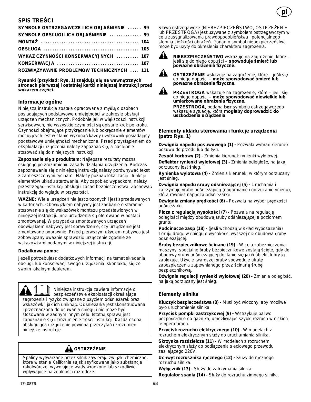 en 18. Never direct discharge at bystanders or allow anyone in front of the unit. 19. Never leave a running unit unattended. Always disengage the auger and traction controls, stop engine, and remove keys. 20. Do not operate the unit while under the influence of alcohol or drugs. 21. Keep in mind the operator is responsible for accidents occurring to other people or property. OPERATION NOTE: Illustrations are located on page 2 and on pages 173 through 178. CAUTION: Use only attachments and accessories approved by the manufacturer of the snow thrower (such as tire chains, electric start kits, etc.).