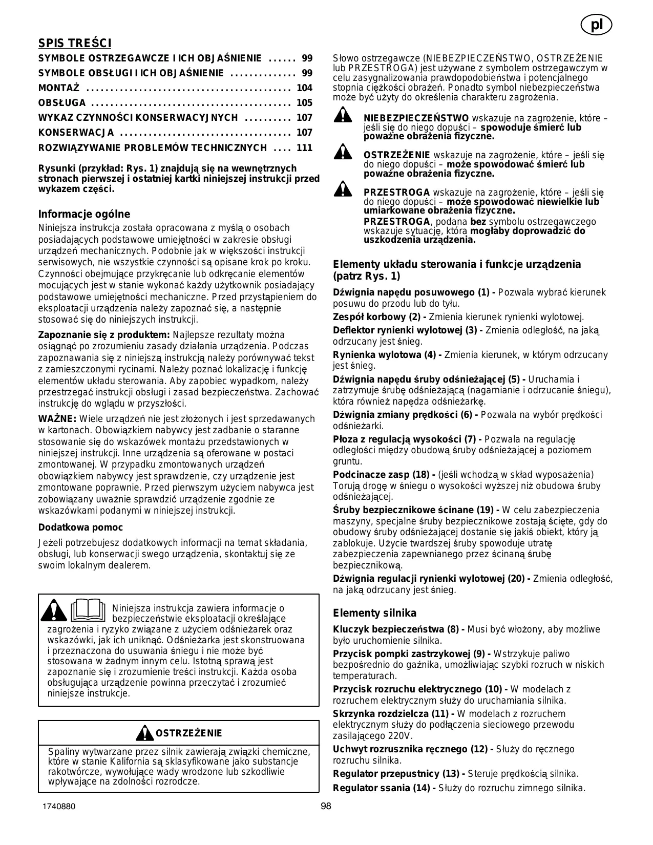 1. Inspectez complètement la zone de traitement et enlevez les paillassons, les luges, les planches, les câbles et tous les autres objets étrangers à l’équipement. 2. Débrayez tous les embrayages et mettez au point mort avant de démarrer la machine (moteur). 3. N’utilisez jamais l’équipement sans porter une tenue d’hiver appropriée. Portez des bottes qui résistent aux surfaces glissantes. Evitez de porter des vêtements larges qui pourraient se prendre dans des pièces mobiles. 4. Manipulez l’essence avec précaution, elle est hautement inflammable. a. Utilisez un récipient à essence homologué. b. N’ajoutez jamais d’essence dans un moteur chaud ou en marche. c. Remplissez le réservoir d’essence avec une extrême précaution à l’extérieur. Ne remplissez jamais le réservoir d’essence à l’intérieur. Revissez le bouchon du réservoir à fond et essuyez l’essence répandue. d. Ne remplissez jamais des récipients à l’intérieur d’un véhicule, d’un camion ou d’une remorque avec une bâche en plastique. Placez toujours les récipients sur le sol, loin des véhicules, avant de les remplir. e. Si cela est plus pratique, enlevez les appareils fonctionnant à l’essence du camion ou de la remorque et remplissez−les à même le sol. Si ce n’est pas possible, alors remplissez avec un récipient portable plutôt qu’à partir du gicleur du distributeur de carburant. f. Maintenez le gicleur en contact avec le bord du réservoir de carburant ou l’ouverture du récipient jusqu’à ce que le remplissage soit complet. N’utilisez pas un outil de fermeture/ouverture de gicleur. g. Revissez le bouchon du réservoir à fond et essuyez l’essence répandue. h. Si de l’essence s’est répandue sur les vêtements, changez−les immédiatement. 5. Utilisez des rallonges et des récipients tel qu’indiqué par le fabricant pour toutes les machines ayant des moteurs à fonctionnement ou à propulsion électrique. 1740880