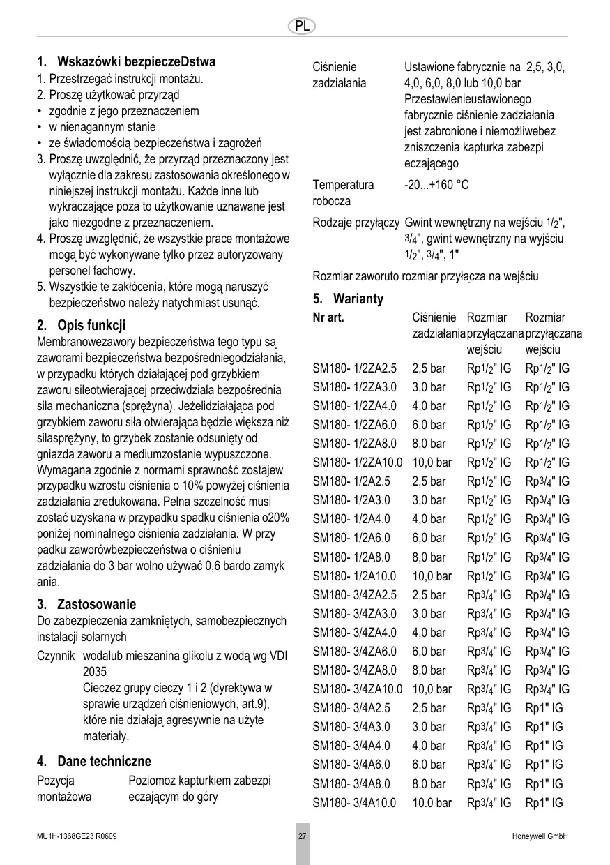 Honeywell GmbH PL 1. Wskazówki bezpieczeDstwa 1. Przestrzegać instrukcji montażu. 2. Proszę użytkować przyrząd • zgodnie z jego przeznaczeniem • w nienagannym stanie • ze świadomością bezpieczeństwa i zagrożeń 3. Proszę uwzględnić, że przyrząd przeznaczony jest wyłącznie dla zakresu zastosowania określonego w niniejszej instrukcji montażu. Każde inne lub wykraczające poza to użytkowanie uznawane jest jako niezgodne z przeznaczeniem. 4. Proszę uwzględnić, że wszystkie prace montażowe mogą być wykonywane tylko przez autoryzowany personel fachowy. 5. Wszystkie te zakłócenia, które mogą naruszyć bezpieczeństwo należy natychmiast usunąć.