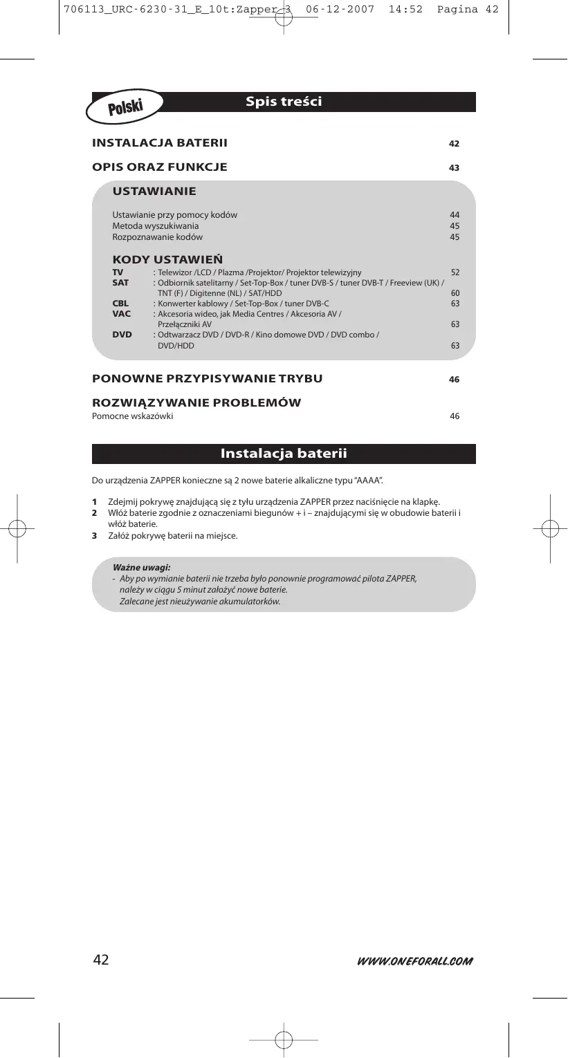URC 6231 - Uniwersalny pilot ONEFORALL - Bezpłatna instrukcja obsługi