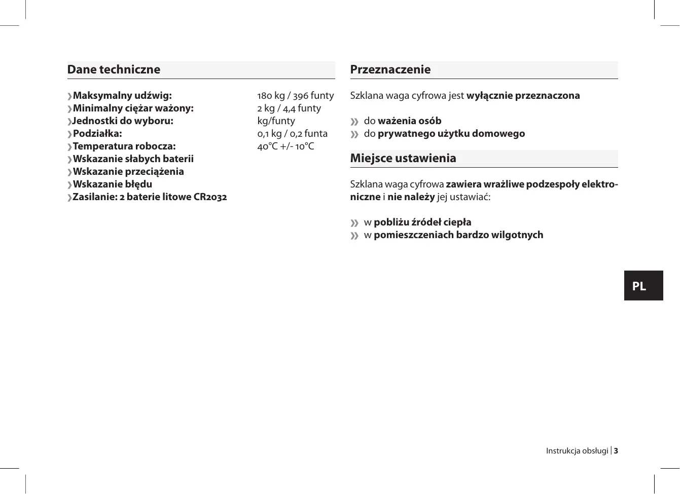 | Instrukcja obsługi Dane techniczne ›Maksymalny udźwig: ›Minimalny ciężar ważony: ›Jednostki do wyboru: › Podziałka: ›Temperatura robocza: ›Wskazanie słabych baterii ›Wskazanie przeciążenia ›Wskazanie błędu ›Zasilanie: baterie litowe CR Przeznaczenie kg / funty kg / , funty kg/funty , kg / , funta o°C +/- °C Szklana waga cyfrowa jest wyłącznie przeznaczona » do ważenia osób » do prywatnego użytku domowego Miejsce ustawienia Szklana waga cyfrowa zawiera wrażliwe podzespoły elektroniczne i nie należy jej ustawiać: » w pobliżu źródeł ciepła » w pomieszczeniach bardzo wilgotnych