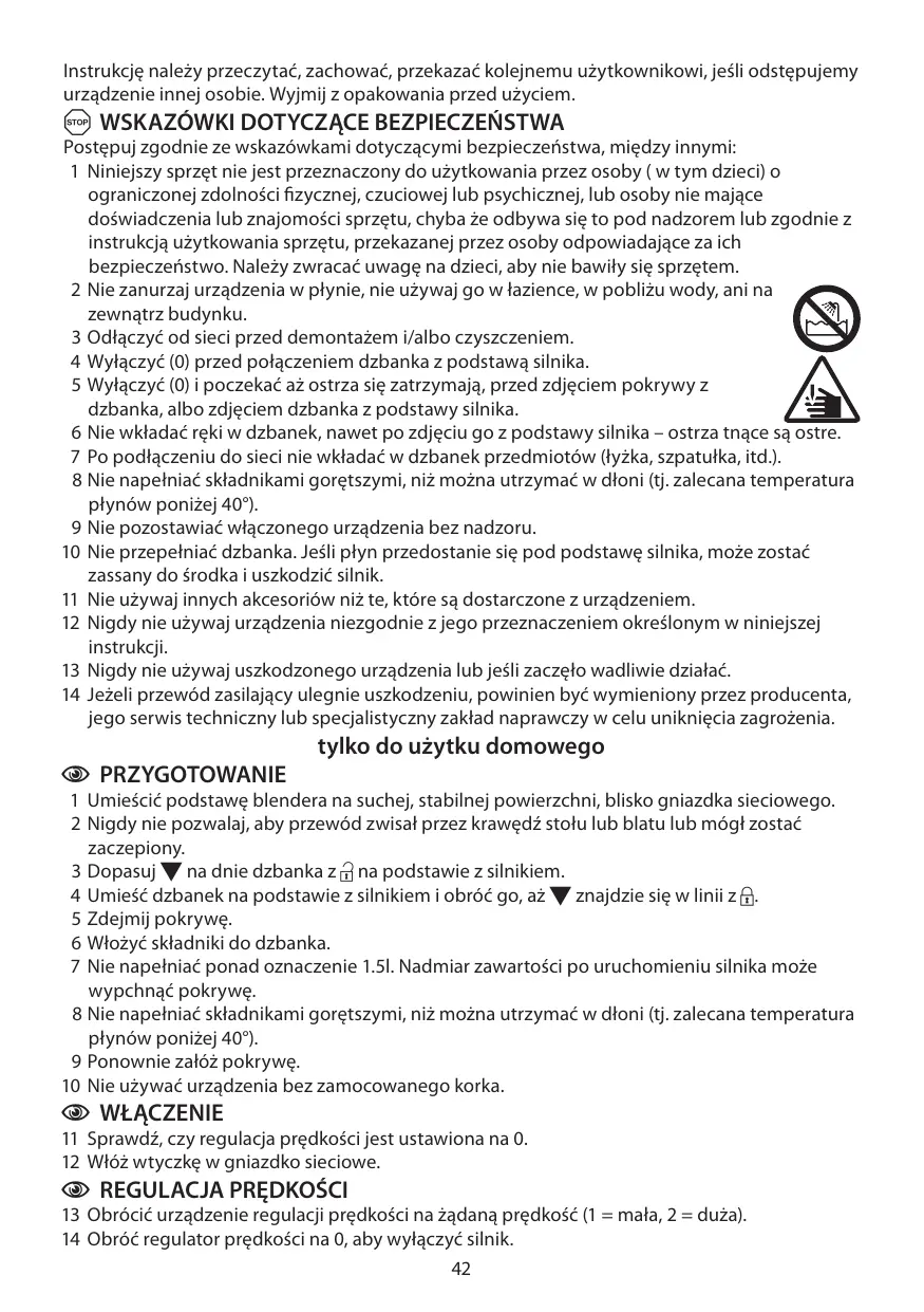 3 Odtaczyé od sieci przed demontazem i/albo czyszczeniem. 4 Wylaczyé (0) przed polaczeniem dzbanka z podstawa silnika. 5 Wytaczyé (0) i poczekaé az ostrza sie zatrzymaja, przed zdjeciem pokrywy z dzbanka, albo zdjeciem dzbanka z podstawy silnika. 6 Nie wktadaé reki w dzbanek, nawet po zdjeciu go z podstawy silnika - ostrza tnace sa ostre. 7 Po podaczeniu do sieci nie wkladaé w dzbanek przedmiotéw (tyzka, szpatuka, itd). 8 Nie napelniaé skladnikami goretszymi, niz mozna utrzymaé w dioni (tj. zalecana temperatura plynôw ponizej 40°). 9 Nie pozostawiaé wlaczonego urzadzenia bez nadzoru. 10 Nie przepelniaé dzbanka. Jesli plyn przedostanie sie pod podstawe silnika, moze zostaé zassany do érodka i uszkodzié silnik. 11 Nie uzywaj innych akcesoriôw niz te, ktére sa dostarezone z urzadzeniem. 12 Nigdy nie uzywaj urzadzenia niezgodnie z jego przeznaczeniem okreélonym w niniejszej instrukcji. 13 Nigdy nie uzywaj uszkodzonego urzadzenia lub jesli zaczelo wadliwie dziataé. 14 Jeeli przewéd zasilajacy ulegnie uszkodzeniu, powinien byé wymieniony przez producenta, jego serwis techniczny lub specjalistyczny zaklad naprawczy w celu unikniecia zagrozenia.