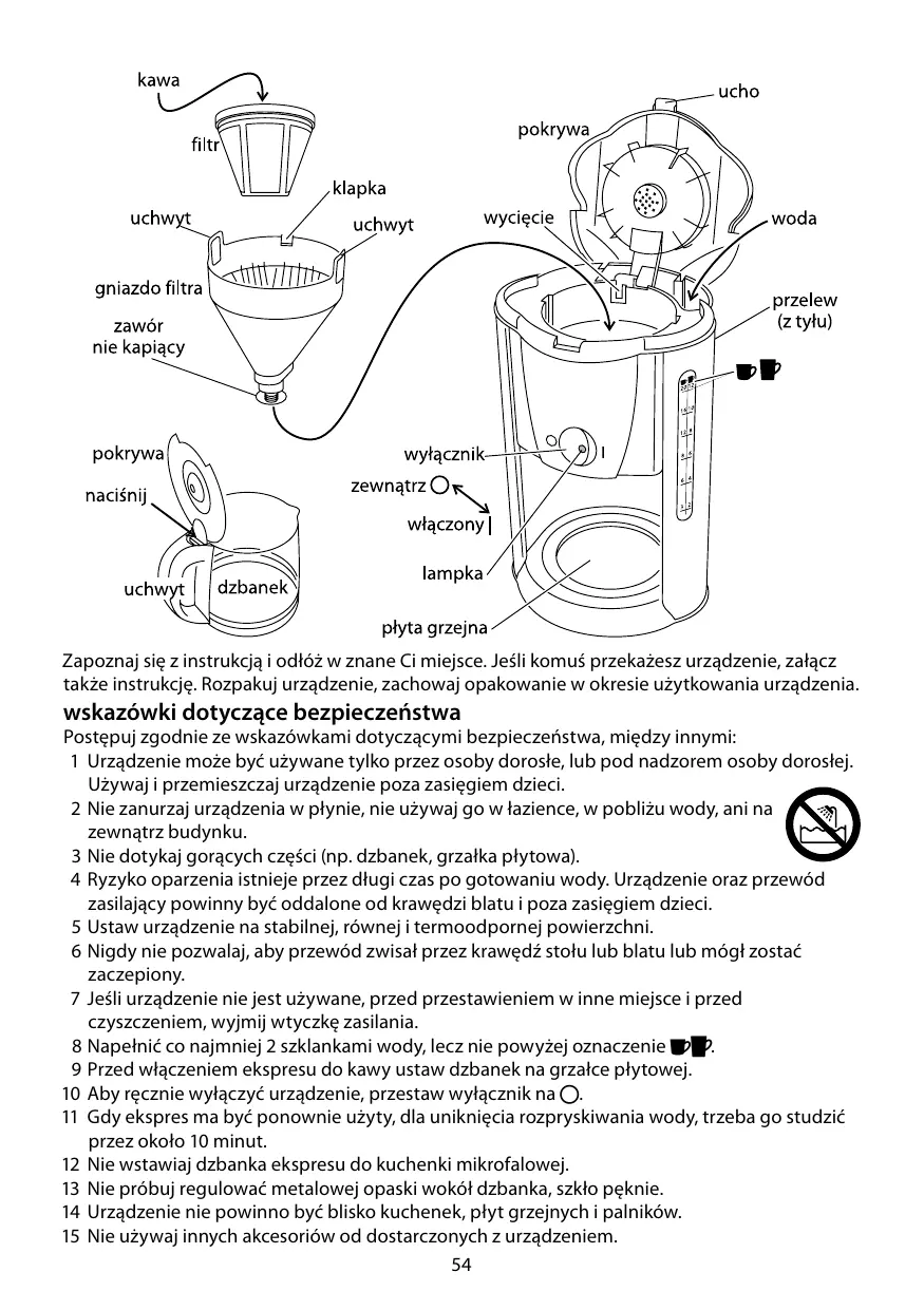 wskazówki dotyczące bezpieczeństwa Postępuj zgodnie ze wskazówkami dotyczącymi bezpieczeństwa, między innymi: 1 Urządzenie może być używane tylko przez osoby dorosłe, lub pod nadzorem osoby dorosłej. Używaj i przemieszczaj urządzenie poza zasięgiem dzieci. 2 Nie zanurzaj urządzenia w płynie, nie używaj go w łazience, w pobliżu wody, ani na zewnątrz budynku. 3 Nie dotykaj gorących części (np. dzbanek, grzałka płytowa). 4 Ryzyko oparzenia istnieje przez długi czas po gotowaniu wody. Urządzenie oraz przewód zasilający powinny być oddalone od krawędzi blatu i poza zasięgiem dzieci. 5 Ustaw urządzenie na stabilnej, równej i termoodpornej powierzchni. 6 Nigdy nie pozwalaj, aby przewód zwisał przez krawędź stołu lub blatu lub mógł zostać zaczepiony. 7 Jeśli urządzenie nie jest używane, przed przestawieniem w inne miejsce i przed czyszczeniem, wyjmij wtyczkę zasilania. 8 Napełnić co najmniej 2 szklankami wody, lecz nie powyżej oznaczenie ;:. 9 Przed włączeniem ekspresu do kawy ustaw dzbanek na grzałce płytowej. 10 Aby ręcznie wyłączyć urządzenie, przestaw wyłącznik na 0. 11 Gdy ekspres ma być ponownie użyty, dla uniknięcia rozpryskiwania wody, trzeba go studzić przez około 10 minut. 12 Nie wstawiaj dzbanka ekspresu do kuchenki mikrofalowej. 13 Nie próbuj regulować metalowej opaski wokół dzbanka, szkło pęknie. 14 Urządzenie nie powinno być blisko kuchenek, płyt grzejnych i palników. 15 Nie używaj innych akcesoriów od dostarczonych z urządzeniem. 54