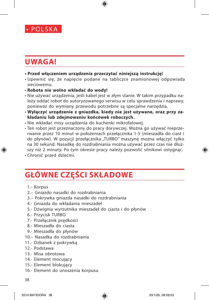 KO] UWAGA! + Przed wlaczeniem urzadzenia przeczytaé niniejsza instrukcje! + Upewnié sie, Ze napiecie podane na tabliczce znamionowej odpowiada sieciowemu. + Robota nie wolno wkladaé do wody! + Nie uzywaé urzadzenia, jesli kabel jest w zlym stanie. W takim przypadku na- lezy oddaé robot do autoryzowanego serwisu w celu sprawdzenia i naprawy, poniewaz do wymiany przewodu potrzebne sa specjalne narzedzia. + Wylaczyé urzadzenie z gniazdka, kiedy nie jest uiywane, oraz przy za- kladaniu lub zdejmowaniu koñcéwek roboczych. + Nie wkladaé misy urzadzenia do kuchenki mikrofalowei. + Ten robot jest przeznaczony do pracy dorywezej. Moina go uzywaé nieprze- rwanie przez 10 minut w polozeniach przelacznika 1-5 (mieszadla do ciast i do plynéw). W pozycji przelacznika , TURBO" maszyne moëna wlaczyé tylko na 30 sekund. Nasadke do rozdrabniania mozna uzywaé przez czas nie diuz- szy niz 2 minuty. Po tym okresie pracy nalezy pozwolié silnikowi ostygnaé. + Chronié przed dzieémi.