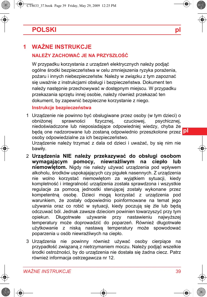 2 Urzadzenia NIE naleź przy krēkazywać do obśglu osobom wymagajacym pomocy, niewrażliwym na ciepl₀ lub niemowłętom. Nigdy nie naleź uzywać urzadzenia pod wptywem alkoholu, siodków uspokajacychczy piŋulek nasennych. Z urzadzenia nie wolno korzystać niemowłętom za wyjatkiem sytuacci, kiedy kompletność i integralność urzadzenia zostala sprawdzone i wzystkie regulacje za pomocamy Jednostki sterujucej zostaly wykonane przy czkompetentná osobe. Dzieci moga korzystać z urzadzenia pod warunkiem, ze zostaly odpowiednio poinformOWANE na temat seinen uzywania oraz co robic w sytuacci, kiedy poczuja są zle lub;będ odczuwać ból. Jednak zawsze daneicom powinien towardyszyc przy tym opiekun. Dlugotrawe uzywanie przy nastawieniu najwyźsej temperaturyMZe doprowadzić do poparzen. Rownież dlugotrawe uzytkOWANIE Z niska nastawa temperatureMZe spowodOWAĆ poparzenia u osob niewrażliwych na ciepl₀.