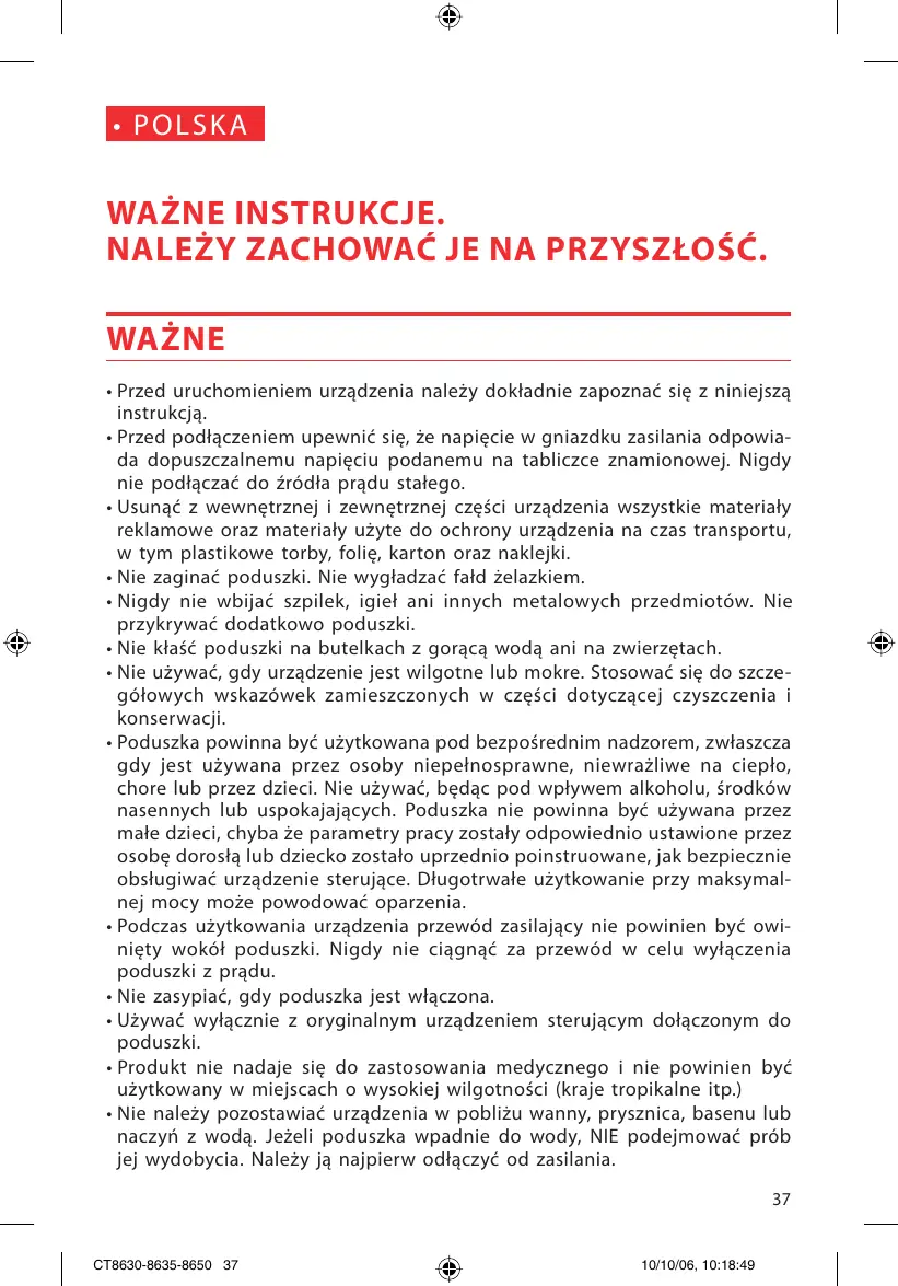 CT8635 - Elektryczna poduszka SOLAC - Bezpłatna instrukcja obsługi