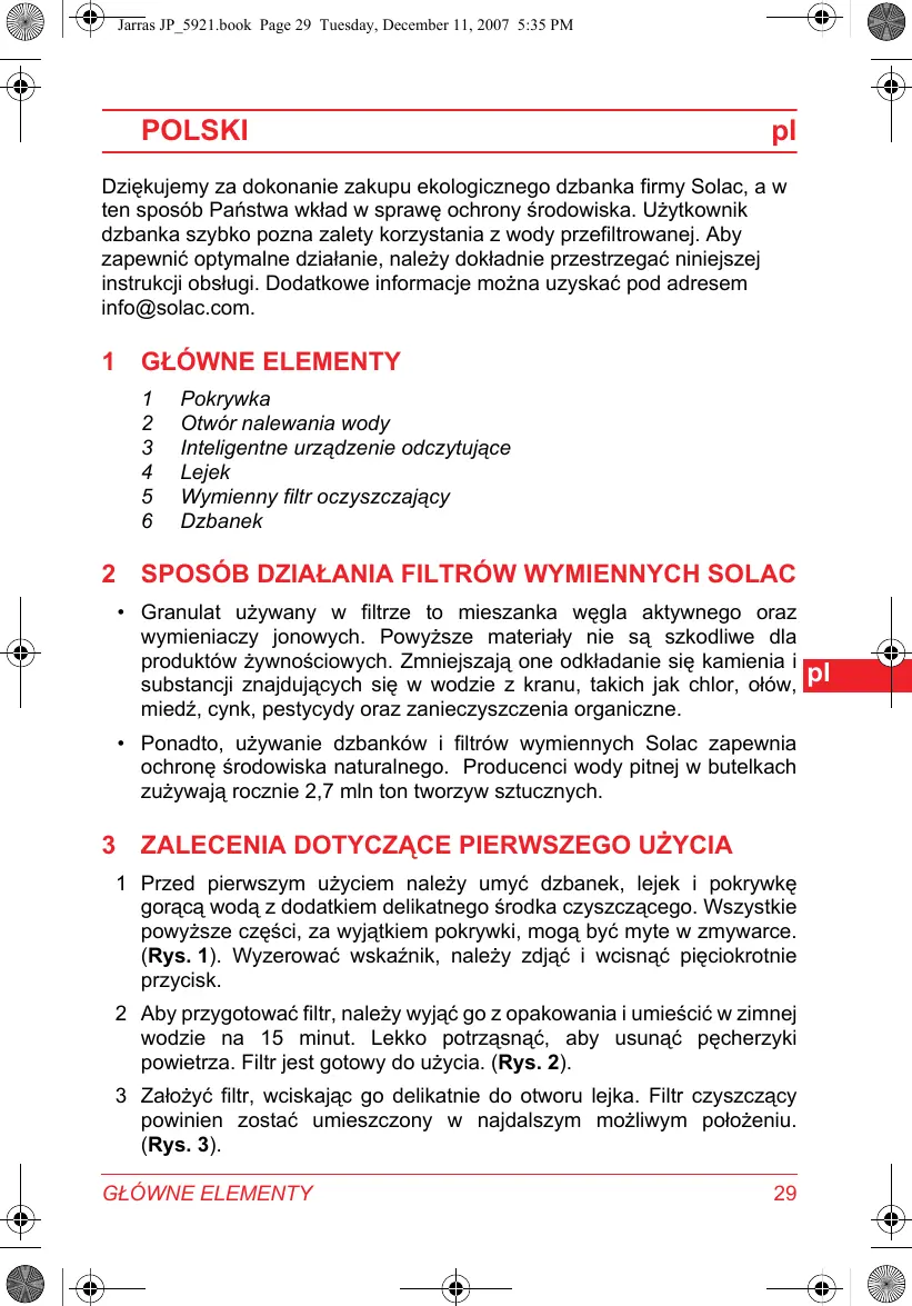 Dziekujemy za dokonanie zakupu ekologiczné dzbanka firmy Solac, a w ten sposob Państwa wiktad w sprawe ochronyŚrodowiska. Użtykownik dzbanka szybko pozna zalety korzystania z wody przyfiltrrowanj. Aby zapewnic optymalne dzialanie, naleź doktadnie przyestręgać niniejszej instrukcj obstugi. Dodatkowe informacja myza uzyskać pod adresem info@solac.com.