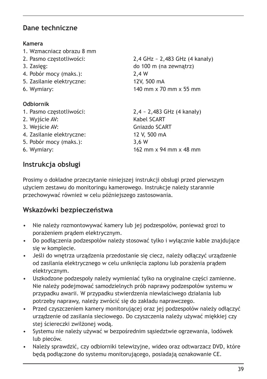 - Przed czyszczemien kamery monitorujucej oraz jej podzespotów daneźy odączyc urzadzenia od zasilania siediociego. Do czyszczenia daneźu uzywać miękkiej czy stej sciereczki zwilzonej woda.