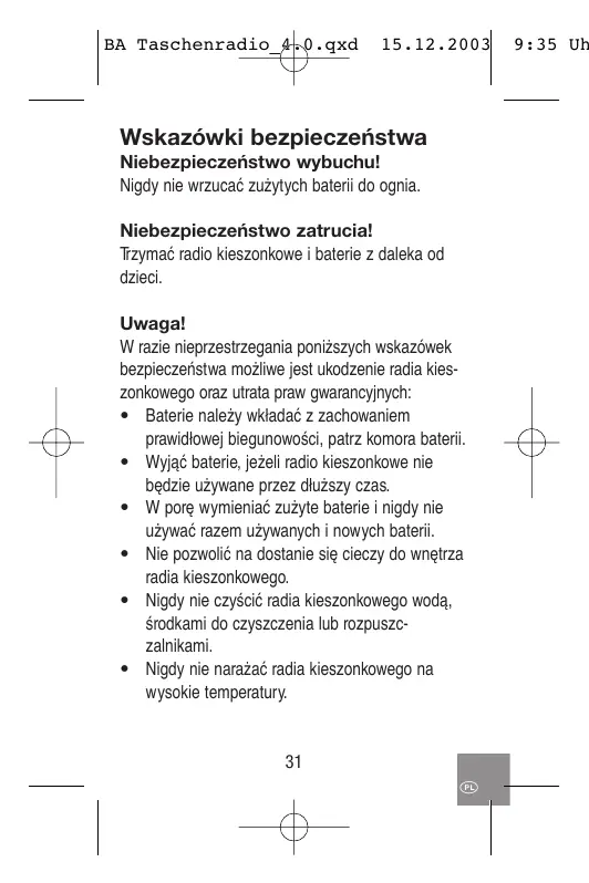 - Wyjać baterie, jeźeli radio kieszonkowe nie bedzie uzywane przy dluszcy czas.