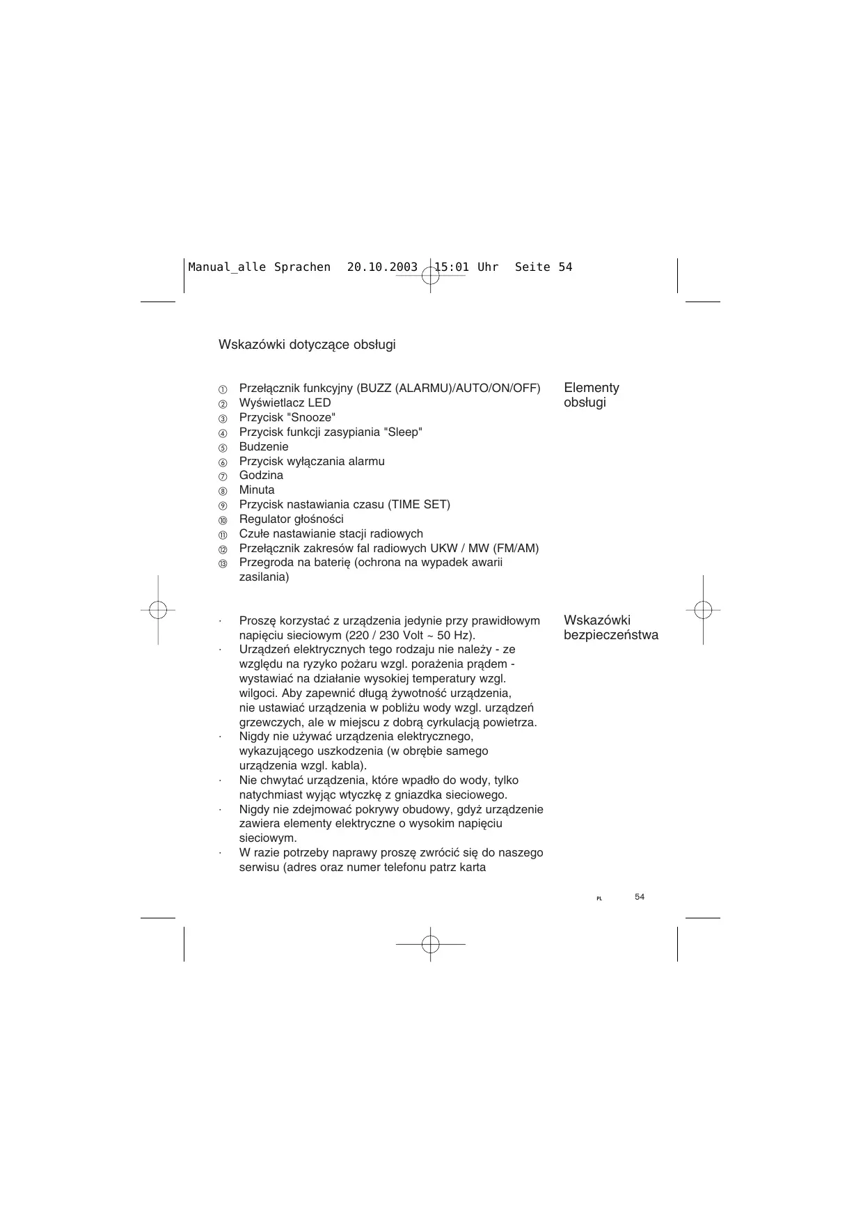Prze∏àcznik funkcyjny (BUZZ (ALARMU)/AUTO/ON/OFF) WyÊwietlacz LED Przycisk "Snooze" Przycisk funkcji zasypiania "Sleep" Budzenie Przycisk wy∏àczania alarmu Godzina Minuta Przycisk nastawiania czasu (TIME SET) Regulator g∏oÊnoÊci Czu∏e nastawianie stacji radiowych Prze∏àcznik zakresów fal radiowych UKW / MW (FM/AM) Przegroda na bateri´ (ochrona na wypadek awarii zasilania) Elementy obs∏ugi Prosz´ korzystaç z urzàdzenia jedynie przy prawid∏owym napi´ciu sieciowym (220 / 230 Volt ~ 50 Hz). Urzàdzeƒ elektrycznych tego rodzaju nie nale˝y - ze wzgl´du na ryzyko po˝aru wzgl. pora˝enia pràdem wystawiaç na dzia∏anie wysokiej temperatury wzgl. wilgoci. Aby zapewniç d∏ugà ˝ywotnoÊç urzàdzenia, nie ustawiaç urzàdzenia w pobli˝u wody wzgl. urzàdzeƒ grzewczych, ale w miejscu z dobrà cyrkulacjà powietrza. Nigdy nie u˝ywaç urzàdzenia elektrycznego, wykazujàcego uszkodzenia (w obr´bie samego urzàdzenia wzgl. kabla). Nie chwytaç urzàdzenia, które wpad∏o do wody, tylko natychmiast wyjàc wtyczk´ z gniazdka sieciowego. Nigdy nie zdejmowaç pokrywy obudowy, gdy˝ urzàdzenie zawiera elementy elektryczne o wysokim napi´ciu sieciowym. W razie potrzeby naprawy prosz´ zwróciç si´ do naszego serwisu (adres oraz numer telefonu patrz karta Wskazówki bezpieczeƒstwa