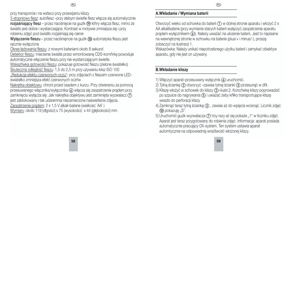 Autoflesz: po walksni przesuwanym wylacznikiem 6 pojawisi po ok.8 sekundach (przy nowych bateriach) wskazhwa gotowosci fleszu 17.Przy slabym swietle flesz wlacza sie automatycznie. Po kaczdym zdjeciu flesz laduje sie na nowo, jak zabysnie wskazhwa gotowosci fleszu 17flesz jest gotowy do uzycia. Jak wskazhwa gotowosci fleszu po 15 sekundach nie zablysnie, trzeba wymienic baterie.