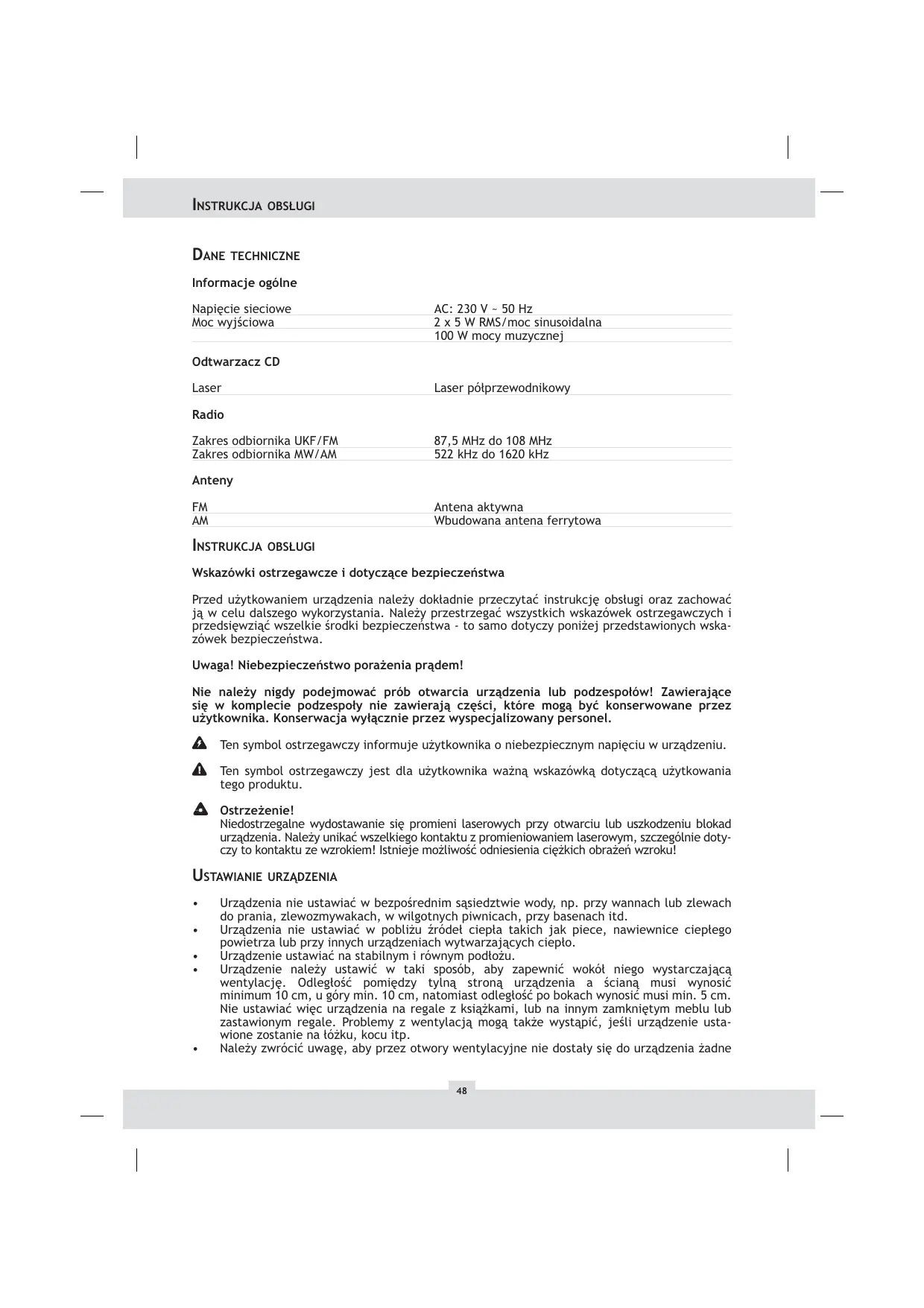 Installez l’appareil sur une base solide et plane. L’appareil doit être installé de telle façon qu’une aération suffisante soit garantie. L’espace laissé entre le côté arrière de l’appareil et le mur devrait être de 10 cm minimum, l’écartaudessus de l’appareil, également, de 10 cm minimum et l’écart latéral, de chaque côté, de 5 cm minimum. Par conséquent, n’installez pas l’appareil dans une bibliothèque, dans un autre meuble fermé ou sur une étagère surchargée. L’aération est également insuffisante lorsque l’appareil est placé sur un lit, une couverture ou dans des conditions similaires. Veillez à ce qu’aucun corps étranger ou liquide ne pénètre dans l’appareil par les orifices d’aération. Le détecteur laser du lecteur de CD peut s’humidifier, lorsque :