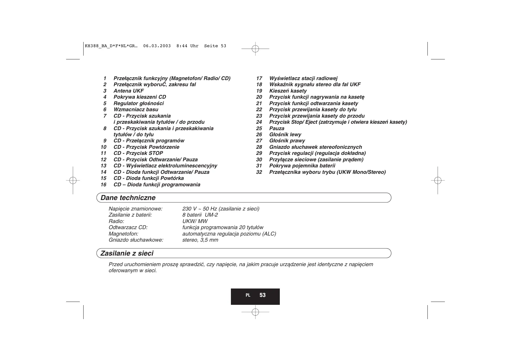 Tensión de la red: Servicio con batería: Servicio de radio: Lector de CD: Grabadora de cassette: Hembrilla auriculares: