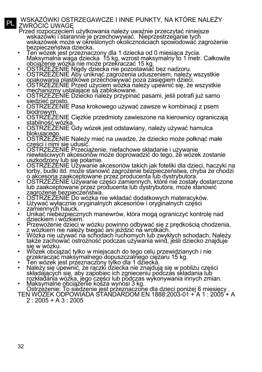Przed rozpoczęciem użytkowania należy uważnie przeczytać niniejsze wskazówki i starannie je przechowywać. Nieprzestrzeganie tych wskazówek może w określonych okolicznościach spowodować zagrożenie bezpieczeństwa dziecka. • Ten wózek jest przeznaczony dla 1 dziecka od 0 miesiąca życia. Maksymalna waga dziecka 15 kg, wzrost maksymalny to 1 metr. Całkowite obciążenie wózka nie może przekraczać 15 kg. • OSTRZEŻENIE Nigdy dziecka nie pozostawiać bez nadzoru. • OSTRZEŻENIE Aby uniknąć zagrożenia uduszeniem, należy wszystkie opakowania plastikowe przechowywać poza zasięgiem dzieci. • OSTRZEŻENIE Przed użyciem wózka należy upewnić się, że wszystkie mechanizmy ustalające są zablokowane. • OSTRZEŻENIE Dziecko należy przypinać pasami, jeśli potrafi już samo siedzieć prosto. • OSTRZEŻENIE Pasa krokowego używać zawsze w kombinacji z psem biodrowym. • OSTRZEŻENIE Ciężkie przedmioty zawieszone na kierownicy ograniczają stabilność wózka. • OSTRZEŻENIE Gdy wózek jest odstawiany, należy używać hamulca blokującego. • OSTRZEŻENIE Należy mieć na uwadze, że dziecko może połknąć małe części i nimi się udusić. • OSTRZEŻENIE Przeciążenie, niefachowe składanie i używanie niewłaściwych akcesoriów może doprowadzić do tego, że wózek zostanie uszkodzony lub się połamie. • OSTRZEŻENIE Używanie akcesoriów takich jak foteliki dla dzieci, haczyki na torby, budki itd. może stanowić zagrożenie bezpieczeństwa, chyba że chodzi o akcesoria zaakceptowane przez producenta lub dystrybutora. • OSTRZEŻENIE Używanie części zamiennych, które nie zostały dostarczone lub zaakceptowane przez producenta lub dystrybutora, może stanowić zagrożenie bezpieczeństwa. • OSTRZEŻENIE Do wózka nie wkładać dodatkowych materacyków. • Używać wyłącznie oryginalnych akcesoriów i oryginalnych części zamiennych hauck. • Unikać niebezpiecznych manewrów, która mogą ograniczyć kontrolę nad dzieckiem i wózkiem. • Przewożenie dzieci w wózku powinno odbywać się z prędkością chodzenia, z wózkiem nie należy biegać ani jeździć na wrotkach. • Wózka nie używać na schodach ruchomych lub zwykłych schodach. Należy także zachować ostrożność podczas używania wind, jeśli dziecko znajduje się w wózku. • Wózek obciążać tylko w miejscach do tego celu przewidzianych i nie przekraczać maksymalnego dopuszczalnego ciężaru 15 kg. • Ten wózek jest przeznaczony tylko dla 1 dziecka. • Należy się upewnić, że rączki dziecka nie znajdują się w pobliżu części składających się, aby zapobiec ich zgnieceniu podczas składania lub rozkładania wózka, jego części lub podczas wykonywania innych zmian. • Maksymalne obciążenie kosza wynosi 3 kg. Ostrzeżenie: To siedzenie jest przeznaczone dla dzieci poniżej 6 miesięcy . TEN WÓZEK ODPOWIADA STANDARDOM EN 1888:2003-01 + A 1 : 2005 + A 2 : 2005 + A 3 : 2005