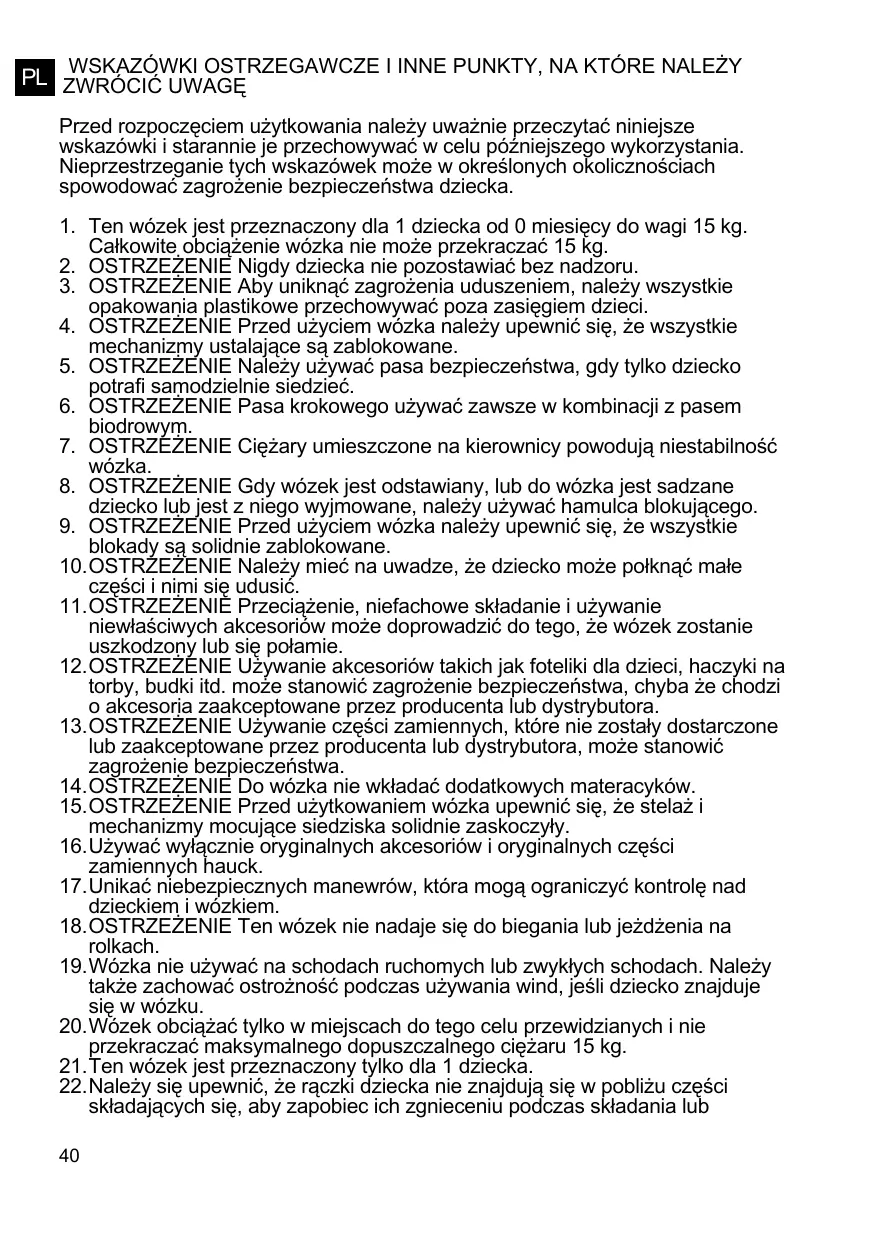 1. Cette poussette est conçue pour un enfant à partir de 0 mois et jusqu‘à un poids de 15 kg. La charge maximale de la poussette ne doit pas dépasser 15 kg. 2. AVERTISSEMENT : Ne laissez jamais votre enfant sans surveillance. 3. AVERTISSEMENT : conservez tous les conditionnements en plastique hors de portée des enfants en prévention de tout danger d‘asphyxie. 4. AVERTISSEMENT : assurez-vous que tous les dispositifs d‘arrêt de la poussette ont été correctement bloqués avant de vous en servir. 5. AVERTISSEMENT : servez-vous d‘un harnais de sécurité dès que votre enfant peut se tenir assis tout seul. 6. AVERTISSEMENT : servez-vous toujours de la ceinture entre les jambes en combinaison avec la ceinture pour la hanche. 7. AVERTISSEMENT : les charges suspendues au guidon ou aux cannes influencent la stabilité de la poussette. 8. AVERTISSEMENT : utilisez toujours le frein d‘arrêt lorsque vous immobilisez la poussette et chaque fois que vous placez l‘enfant dans la poussette ou que vous le retirez. 9. AVERTISSEMENT : assurez-vous que tous les dispositifs d‘arrêt de la poussette ont été correctement enclenchés avant de vous en servir. 10.AVERTISSEMENT : n‘oubliez jamais que votre enfant pourrait avaler les petites pièces et s‘asphyxier. 11.AVERTISSEMENT : les surcharges, un repliage non conforme à l‘usage prévu et l‘emploi d‘accessoires non homologués peuvent endommager la poussette ou provoquer son effondrement. 12.AVERTISSEMENT : l‘emploi d‘accessoires, tels les sièges pour enfant, crochets pour sacs, capots protège-pluie etc. est susceptible de présenter un risque, sauf s‘il s‘agit d‘accessoires homologués par le fabricant ou le distributeur. 13.AVERTISSEMENT : l‘emploi de pièces de rechange non fournies ou homologuées par le fabricant ou le distributeur peut présenter un risque pour la sécurité. 14.AVERTISSEMENT : ne posez jamais de matelas supplémentaires dans la poussette. 15.AVERTISSEMENT : veillez, avant de vous servir de la poussette, à ce que le bâti et les dispositifs de fixation de l‘assise soient correctement enclenchés. 16.Utilisez exclusivement des accessoires d‘origine et des pièces de rechange d‘origine de la maison hauck. 17.Evitez toutes les situations d‘emploi extrêmes, qui risquent de réduire votre contrôle sur l’enfant et la poussette. 18.AVERTISSEMENT : cette poussette n‘est pas appropriée à la pratique du jogging ou de patins en ligne. 19.Ne vous servez pas de la poussette sur des escaliers roulants ou des escaliers en général et soyez prudent dans les ascenseurs tant que votre enfant occupe la poussette. 17