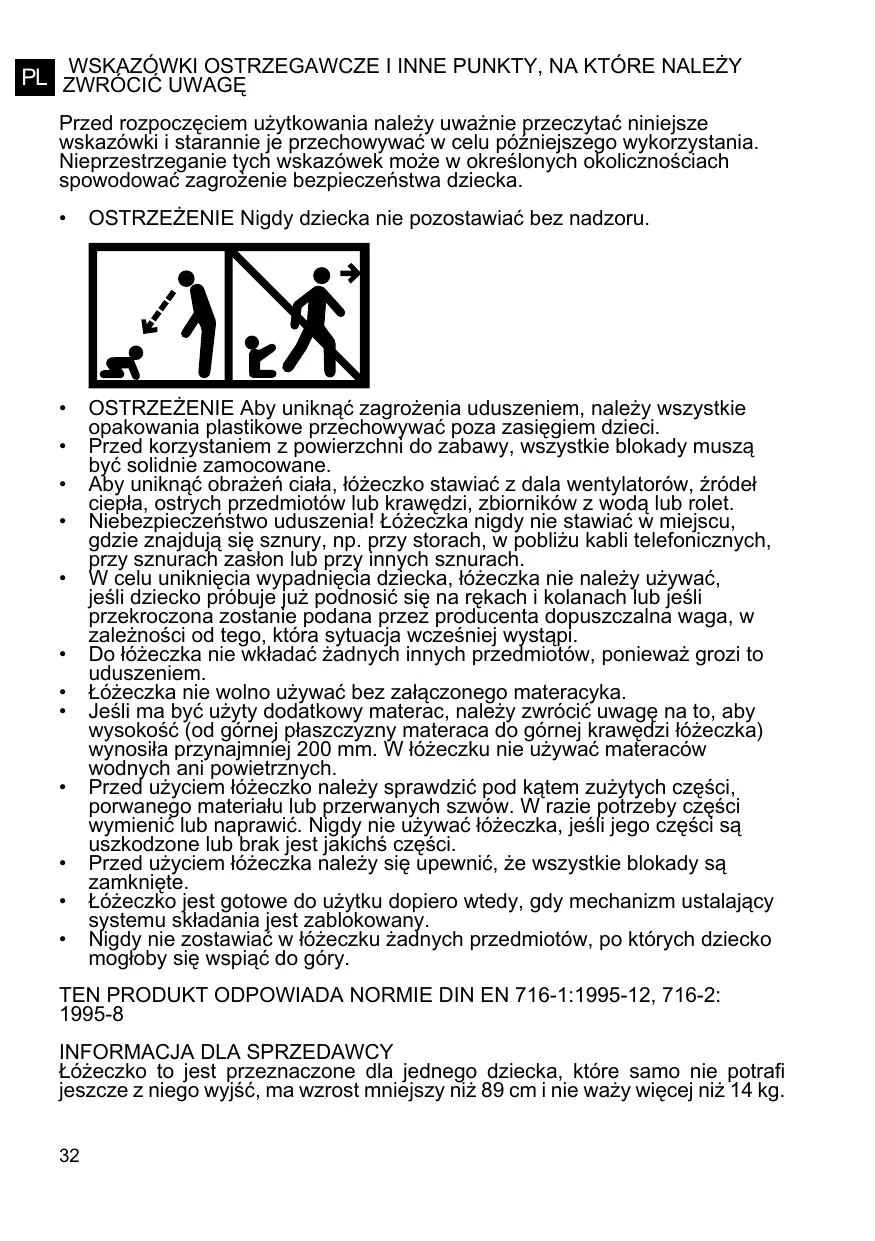 • Risque d‘étranglement : ne mettez jamais le lit d‘appoint en place près de cordons, par exemple ceux de nouveaux rideaux, ou à proximité de câbles téléphoniques et de cordons de rideaux ou de fils ou ficelles de tout genre. Evitez les risques de chute de votre enfant en renonçant à l‘emploi du lit d‘appoint dès que votre enfant tente de se mettre debout à l‘aide des mains et des genoux ou dès que son poids ou sa taille dépasse le poids ou la taille recommandé par le fabricant, selon le cas se présentant en premier. Ne posez jamais des objets qui seraient susceptibles de présenter un risque d‘étranglement pour votre enfant dans le lit d‘appoint. L‘emploi du lit d‘appoint n‘est pas recommandé sans son matelas de fond fourni. Si vous voulez utiliser un matelas supplémentaire, veillez à ce que la hauteur (du dessus du matelas jusqu‘au bord supérieur du lit d‘appoint) comporte au moins 200 mm. Ne vous servez pas de matelas à eau et de matelas gonflables dans ce lit d‘appoint. Assurez-vous que le lit d‘appoint est dénué de pièces usées, de matériaux déchirés ou de coutures défaites avant de vous en servir. Remplacez ou réparez les pièces, le cas échéant. Renoncez au lit d‘appoint en présence de pièces brisées ou manquantes ! Assurez-vous que tous les blocages du lit sont bien verrouillés avant emploi. Le lit est uniquement près à l‘emploi si le mécanisme de blocage du système de pliage est correctement enclenché. Ne laissez rien dans le lit que l‘enfant pourrait utiliser pour l‘escalader. CE PRODUIT EST CONFORME A LA NORME DIN EN 716-1:1995-12, 716-2: 1995-8