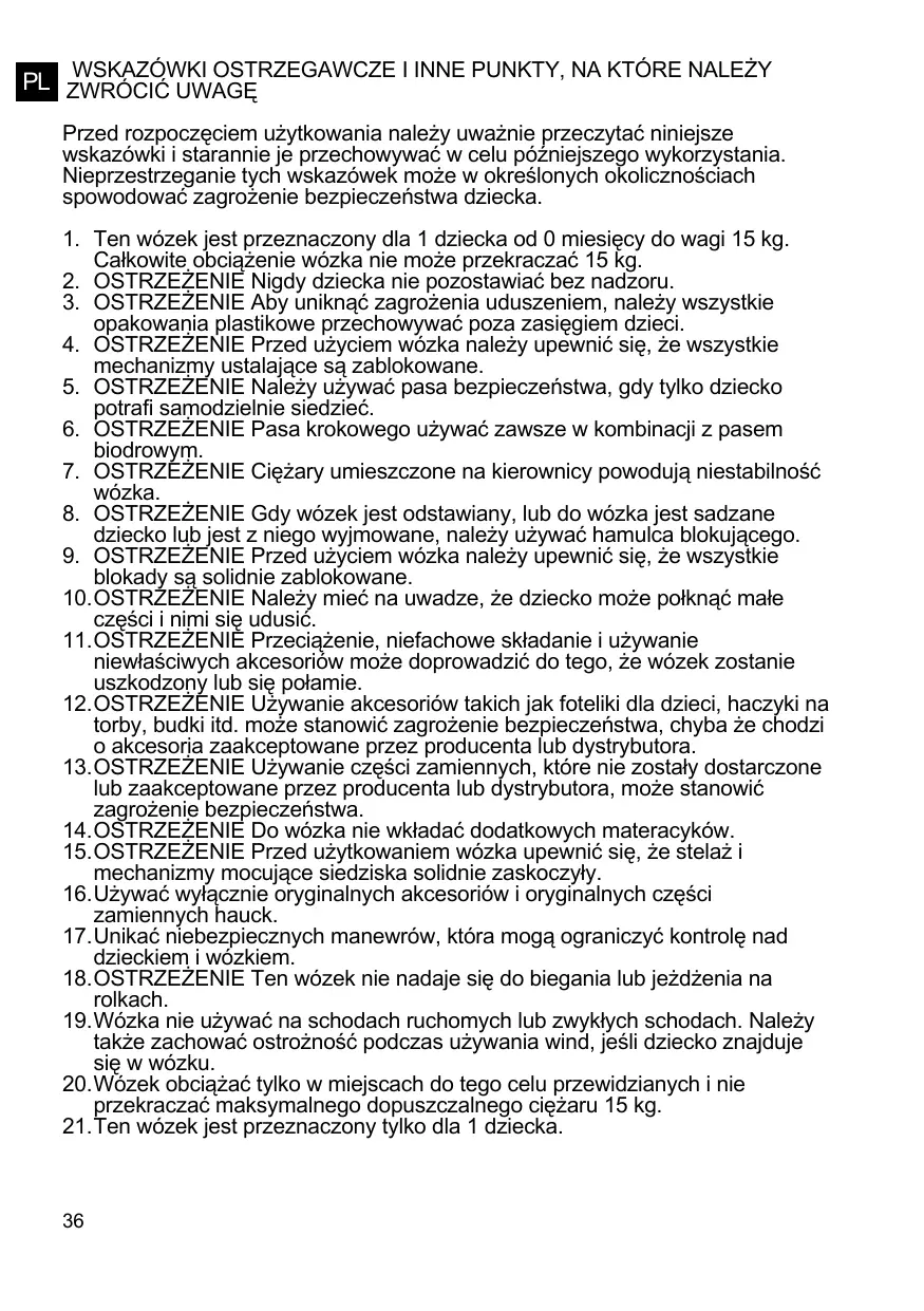 Przed rozpoczęciem użytkowania należy uważnie przeczytać niniejsze wskazówki i starannie je przechowywać w celu późniejszego wykorzystania. Nieprzestrzeganie tych wskazówek może w określonych okolicznościach spowodować zagrożenie bezpieczeństwa dziecka. 1. Ten wózek jest przeznaczony dla 1 dziecka od 0 miesięcy do wagi 15 kg. Całkowite obciążenie wózka nie może przekraczać 15 kg. 2. OSTRZEŻENIE Nigdy dziecka nie pozostawiać bez nadzoru. 3. OSTRZEŻENIE Aby uniknąć zagrożenia uduszeniem, należy wszystkie opakowania plastikowe przechowywać poza zasięgiem dzieci. 4. OSTRZEŻENIE Przed użyciem wózka należy upewnić się, że wszystkie mechanizmy ustalające są zablokowane. 5. OSTRZEŻENIE Należy używać pasa bezpieczeństwa, gdy tylko dziecko potrafi samodzielnie siedzieć. 6. OSTRZEŻENIE Pasa krokowego używać zawsze w kombinacji z pasem biodrowym. 7. OSTRZEŻENIE Ciężary umieszczone na kierownicy powodują niestabilność wózka. 8. OSTRZEŻENIE Gdy wózek jest odstawiany, lub do wózka jest sadzane dziecko lub jest z niego wyjmowane, należy używać hamulca blokującego. 9. OSTRZEŻENIE Przed użyciem wózka należy upewnić się, że wszystkie blokady są solidnie zablokowane. 10. OSTRZEŻENIE Należy mieć na uwadze, że dziecko może połknąć małe części i nimi się udusić. 11. OSTRZEŻENIE Przeciążenie, niefachowe składanie i używanie niewłaściwych akcesoriów może doprowadzić do tego, że wózek zostanie uszkodzony lub się połamie. 12. OSTRZEŻENIE Używanie akcesoriów takich jak foteliki dla dzieci, haczyki na torby, budki itd. może stanowić zagrożenie bezpieczeństwa, chyba że chodzi o akcesoria zaakceptowane przez producenta lub dystrybutora. 13. OSTRZEŻENIE Używanie części zamiennych, które nie zostały dostarczone lub zaakceptowane przez producenta lub dystrybutora, może stanowić zagrożenie bezpieczeństwa. 14. OSTRZEŻENIE Do wózka nie wkładać dodatkowych materacyków. 15. OSTRZEŻENIE Przed użytkowaniem wózka upewnić się, że stelaż i mechanizmy mocujące siedziska solidnie zaskoczyły. 16. Używać wyłącznie oryginalnych akcesoriów i oryginalnych części zamiennych hauck. 17. Unikać niebezpiecznych manewrów, która mogą ograniczyć kontrolę nad dzieckiem i wózkiem. 18. OSTRZEŻENIE Ten wózek nie nadaje się do biegania lub jeżdżenia na rolkach. 19. Wózka nie używać na schodach ruchomych lub zwykłych schodach. Należy także zachować ostrożność podczas używania wind, jeśli dziecko znajduje się w wózku. 20. Wózek obciążać tylko w miejscach do tego celu przewidzianych i nie przekraczać maksymalnego dopuszczalnego ciężaru 15 kg. 21. Ten wózek jest przeznaczony tylko dla 1 dziecka.
