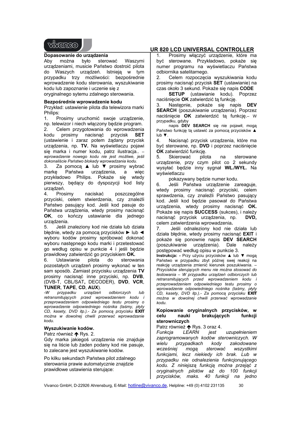 Si vous avez d’autres questions concernant UR 820 LCD, veuillez appeler la ligne SAV de Vivanco au n°: +33(0)4 704 315 16 ou nous envoyer un courriel à l’adresse : hotline@vivanco.fr . Données techniques Batteries : 2x piles micro AAA - 820 LCD indique qu’un changement de piles est nécessaire en affichant le symbole des piles barré d’un trait. Portée : env. 7 m En cas de défaut de votre UR 820 LCD pendant une période de 2 ans à compter de la date d'achat, Vivanco la remplacera gratuitement. Exceptions : codes manquants, destruction intentionnelle et usure normale du boîtier et des touches. (E) Instrucciones de uso Telemando Vivanco UR 820 LCD para casi todos los tipos de televisores, aparatos de audio y vídeo y otros aparatos de mando infrarrojo Colocación de pilas Abra la tapa del compartimiento de pilas situado en la parte trasera del aparato, presione ligeramente hacia abajo la lengüeta y coloque 2 pilas alcalinas redondas (AAA). Preste atención a las polaridades de las pilas indicadas en éstas y en el compartimiento (resorte grande = pila abajo = -) y cierre cuidadosamente el compartimiento. – Siempre debe emplear pilas impecables. Adaptación a los aparatos FAILED (fallo) si el proceso de copia no se ha llevado a cabo correctamente. Repetir el proceso de copia desde el paso 5. 7. El proceso de copia puede finalizar pulsando una tecla (TV, DVB, etc.) siempre que se visualice SELECT KEY en el indicador.