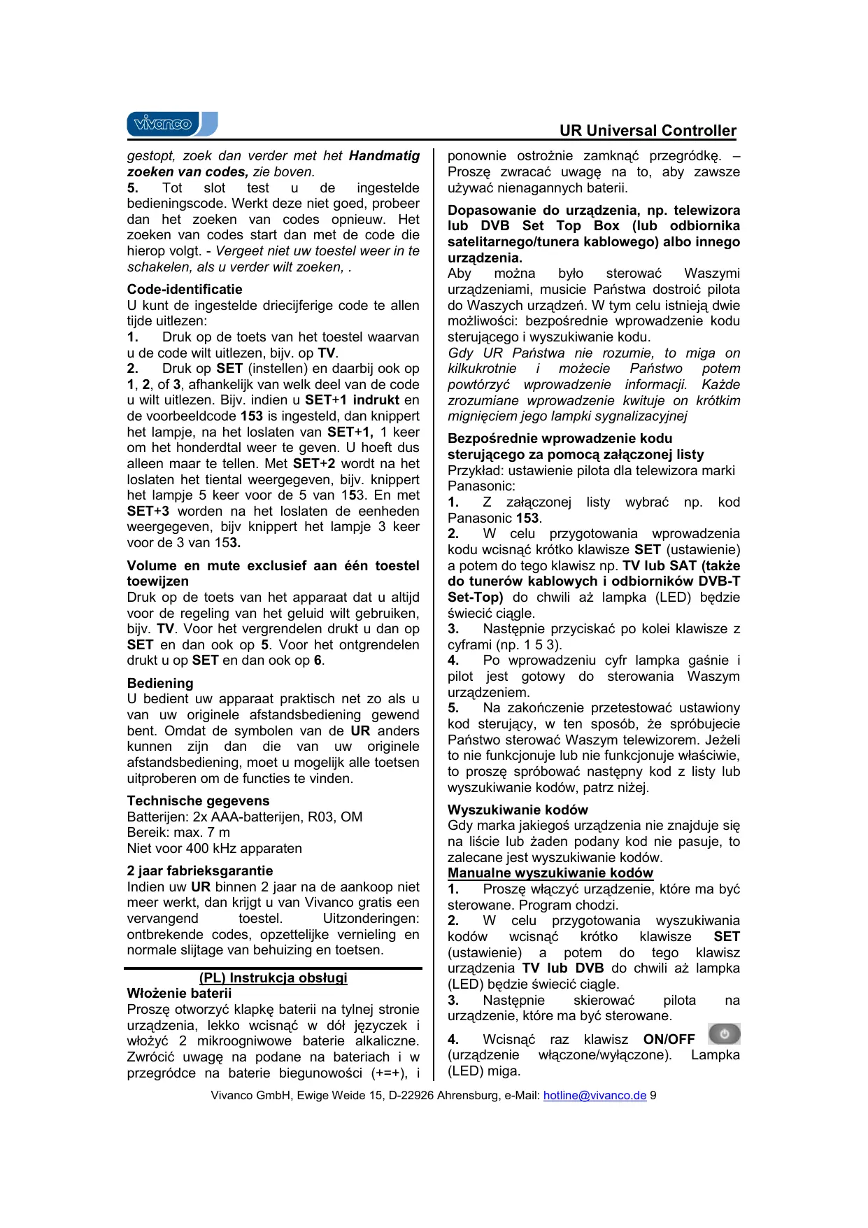 Vivanco la remplacera gratuitement. Exceptions : codes manquants, destruction intentionnelle et usure normale du boîtier et des touches. (E) Instrucciones de uso Colocación de pilas Abra la tapa del compartimiento de pilas situado en la parte trasera del telemando y apriete ligeramente hacia abajo la lengüeta para colocar entonces 2 micro-pilas alcalinas. Preste atención a que están correctas las polaridades indicadas en las pilas y en el compartimiento (+=+) y cierre cuidadosamente el compartimiento. – Rogamos sírvanse de emplear siempre pilas impecables.. Ajuste al un dispositivo, p.ej. un televisor o un receptor DVB Set Top Box (o receptor SAT/sintonizador por cable) o un otro dispositivo. Para poder controlar sus aparatos, debe ajustar su telemando a sus aparatos a mandar. A esto, hay dos posibilidades: la introducción directa de códigos de mando y la búsqueda de códigos. Caso que el UR no le 'entienda', da varios veces luz intermitente y usted puede repetir la introducción del código. Después de cada introducción 'entendida', el telemando confirma dando brevemente luz intermitente mediante la lámpara indicadora. Introducción directa del código de mando por medio de la lista adjuntada Ejemplo: Ajustar el telemando a un televisor de Panasonic: 1. En la lista adjunta encuentra el código Panasonic de, p. ej., 153. En el caso de que la marca de un aparato no esté indicada en la lista o ninguno de los códigos resulte correcto, se recomienda proceder según el método de búsqueda de código. Búsqueda de código manual 1. Active el aparato a mandar. El programa esta puesto. 2.