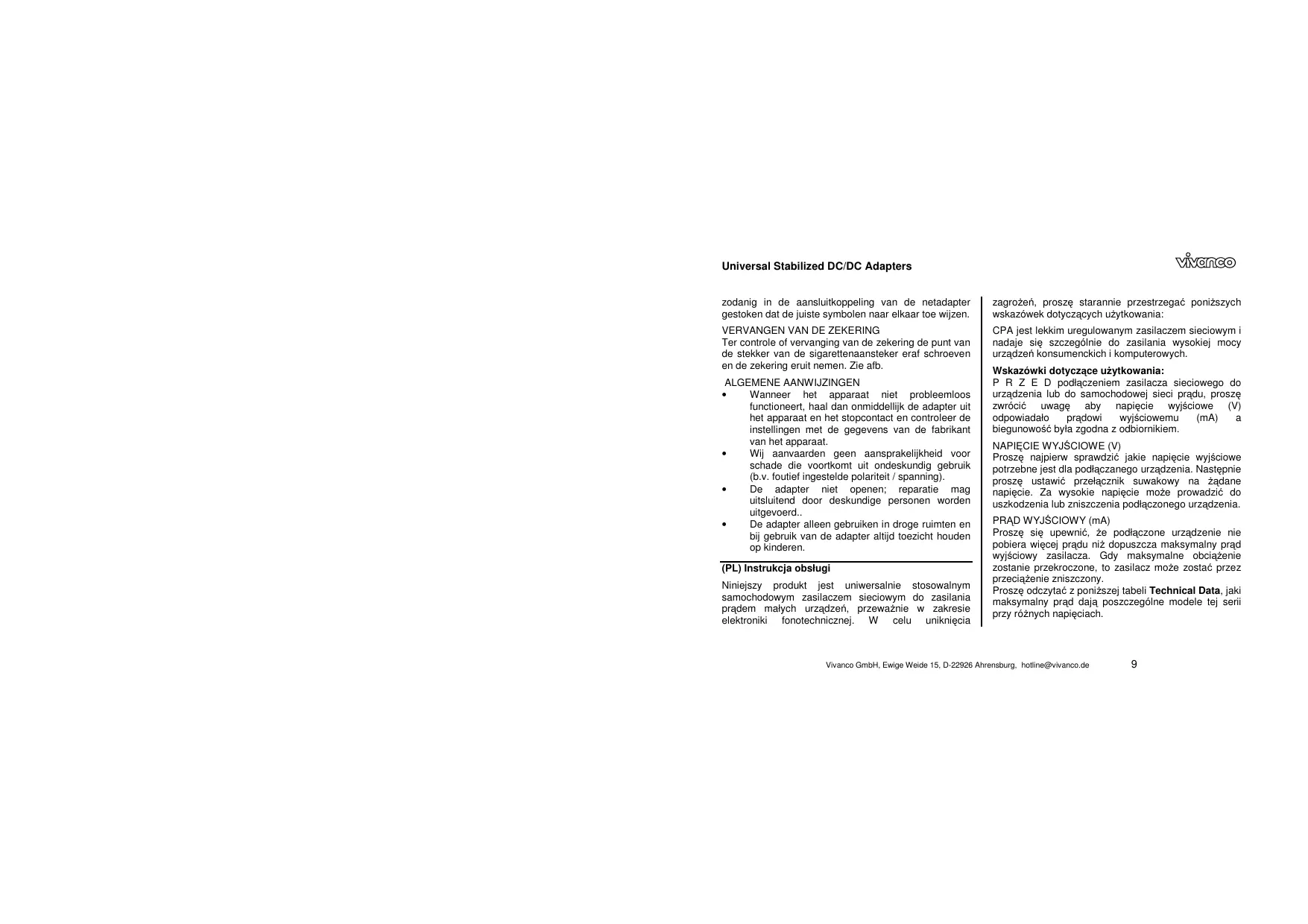 INSTRUKCJA OBSŁUGI UNIVERSAL STABILIZED HIGH-POWER DC ADAPTER VIVANCO
