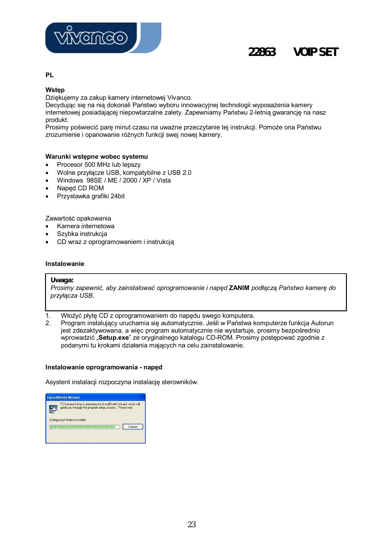 INSTRUKCJA OBSŁUGI WEBPHONE SET WEBCAM VIVANCO