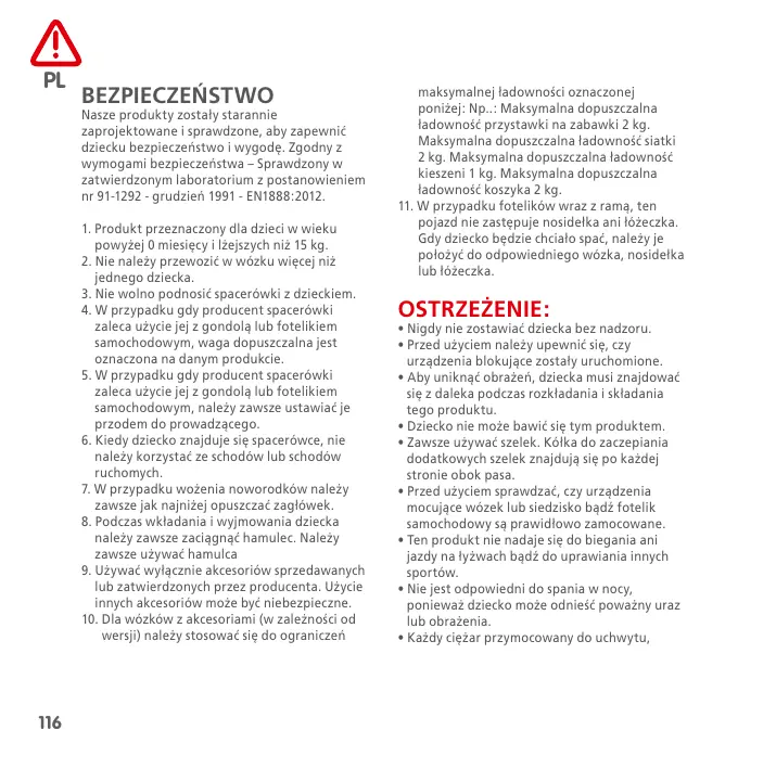 PL BEZPIECZEŃSTWO Nasze produkty zostały starannie zaprojektowane i sprawdzone, aby zapewnić dziecku bezpieczeństwo i wygodę. Zgodny z wymogami bezpieczeństwa – Sprawdzony w zatwierdzonym laboratorium z postanowieniem nr 91-1292 - grudzień 1991 - EN1888:2012. 1. Produkt przeznaczony dla dzieci w wieku powyżej 0 miesięcy i lżejszych niż 15 kg. 2. Nie należy przewozić w wózku więcej niż jednego dziecka. 3. Nie wolno podnosić spacerówki z dzieckiem. 4. W przypadku gdy producent spacerówki zaleca użycie jej z gondolą lub fotelikiem samochodowym, waga dopuszczalna jest oznaczona na danym produkcie. 5. W przypadku gdy producent spacerówki zaleca użycie jej z gondolą lub fotelikiem samochodowym, należy zawsze ustawiać je przodem do prowadzącego. 6. Kiedy dziecko znajduje się spacerówce, nie należy korzystać ze schodów lub schodów ruchomych. 7. W przypadku wożenia noworodków należy zawsze jak najniżej opuszczać zagłówek. 8. Podczas wkładania i wyjmowania dziecka należy zawsze zaciągnąć hamulec. Należy zawsze używać hamulca 9. Używać wyłącznie akcesoriów sprzedawanych lub zatwierdzonych przez producenta. Użycie innych akcesoriów może być niebezpieczne. 10. Dla wózków z akcesoriami (w zależności od wersji) należy stosować się do ograniczeń