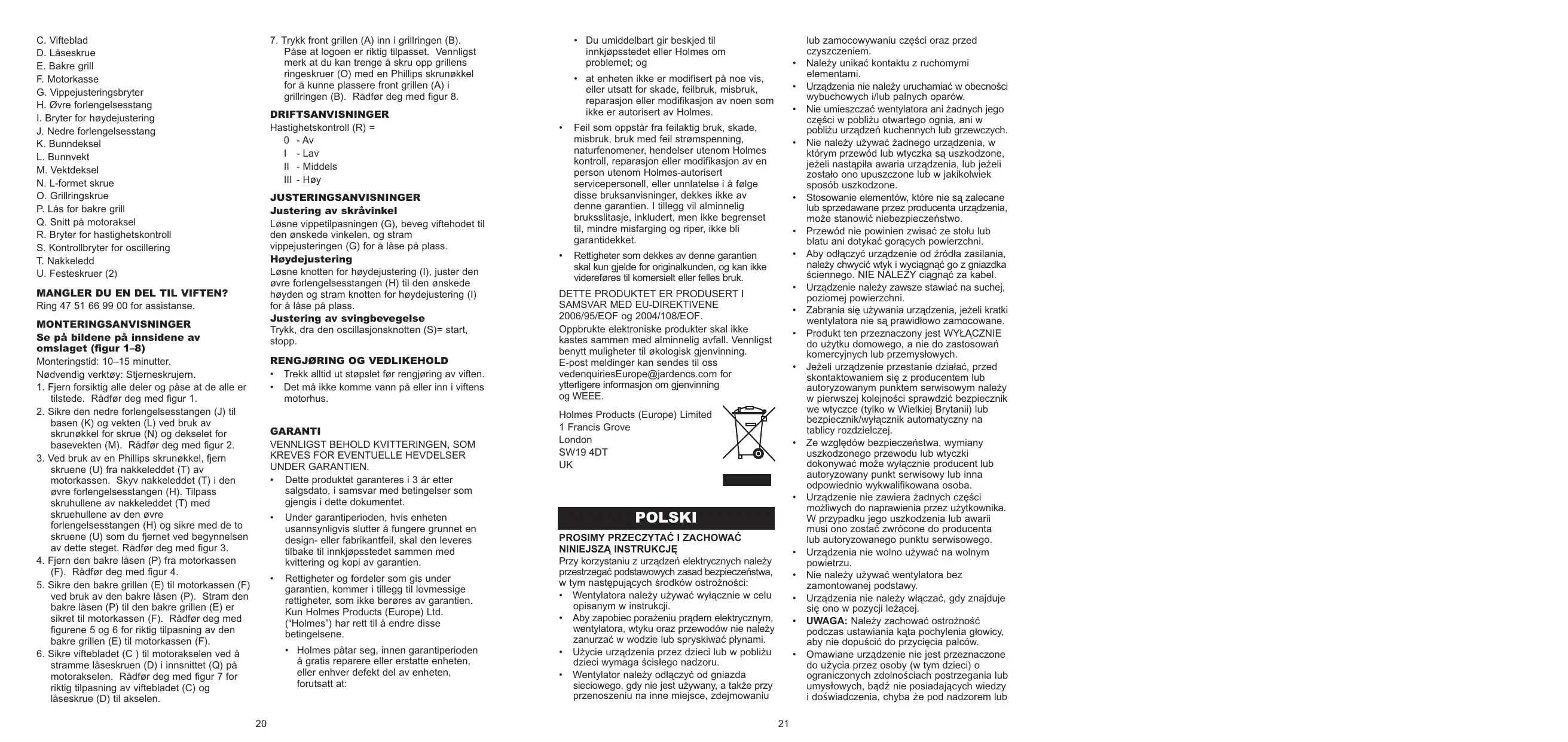 GWARANCJA PROSIMY O ZACHOWANIE RACHUNKU PONIEWAŻ JEGO OKAZANIE BEDZIE KONIECZNE W PRZYPADKU JAKICHKOLWIEK ROSZCZEN GWARANCYJNCH. • Niniejszy produkt objęty gwarancją obowiązującą przez okres 3 lat od daty zakupu produktu, zgodnie z warunkami określonymi w tym dokumencie. • Jeżeli w okresie gwarancyjnym urządzenie przestanie prawidłowo funkcjonować (co jest mało prawdopodobne) z powodu wad konstrukcyjnych lub wykonawczych, należy dokonać jego zwrotu w punkcie zakupu, załączając rachunek i kopię niniejszej gwarancji. • Prawa i świadczenia z tytułu niniejszej gwarancji uzupełniają prawa określone w przepisach, na które niniejsza gwarancja nie ma wpływu. Zmiany niniejszych warunków może dokonać tylko firma Holmes Products (Europe) Ltd. („Holmes”). • Firma Holmes zobowiązuje się w okresie gwarancyjnym do przeprowadzenia bezpłatnej naprawy lub wymiany urządzenia lub dowolnej jego części, która funkcjonuje nieprawidłowo, pod warunkiem, że: • Użytkownik powinien natychmiast poinformować o zaistniałym problemie punkt sprzedaży lub firmę Holmes; oraz • Urządzenie nie było w żaden sposób modyfikowane, uszkodzone lub eksploatowane w niewłaściwy sposób ani naprawiane przez osobę nie posiadającą upoważnienia ze strony firmy Holmes. • Gwarancją nie będą objęte uszkodzenia będące wynikiem niewłaściwego używania, zniszczenia, użytkowania przy nieprawidłowym napięciu, działania sił natury lub zdarzeń, na które firma Holmes nie ma wpływu, napraw dokonywanych przez osoby nie posiadające upoważnienia ze strony firmy Holmes lub postępowania niezgodnego z zasadami określonymi w instrukcji użytkowania. Ponadto, niniejsza gwarancja nie obejmuje normalnego zużycia i zniszczenia, w tym między innymi, drobnych odbarwień i zadrapań. • Prawa określone w tej gwarancji dotyczą tylko pierwotnego nabywcę produktu i nie obejmują użytkowania o charakterze komercyjnym i komunalnym. PRODUKT SPEŁNIA WYMAGANIA DYREKTYW EUROPEJSKICH 2006/95/EWG oraz 2004/108/EWG.