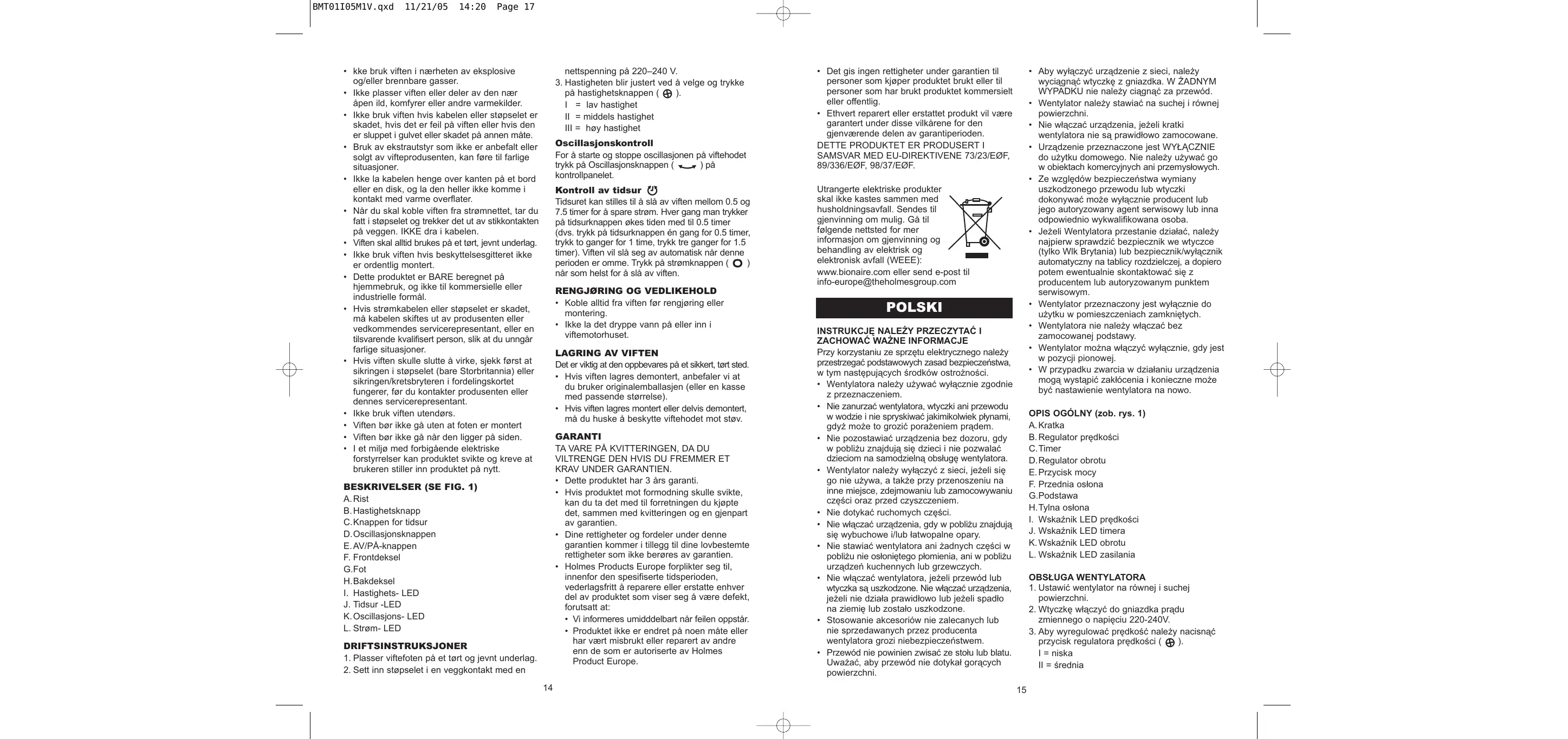 Utrangerte elektriske produkter skal ikke kastes sammen med husholdningsavfall. Sendes til gjenvinning om mulig. Gå til følgende nettsted for mer informasjon om gjenvinning og behandling av elektrisk og elektronisk avfall (WEEE): www.bionaire.com eller send e-post til info-europe@theholmesgroup.com