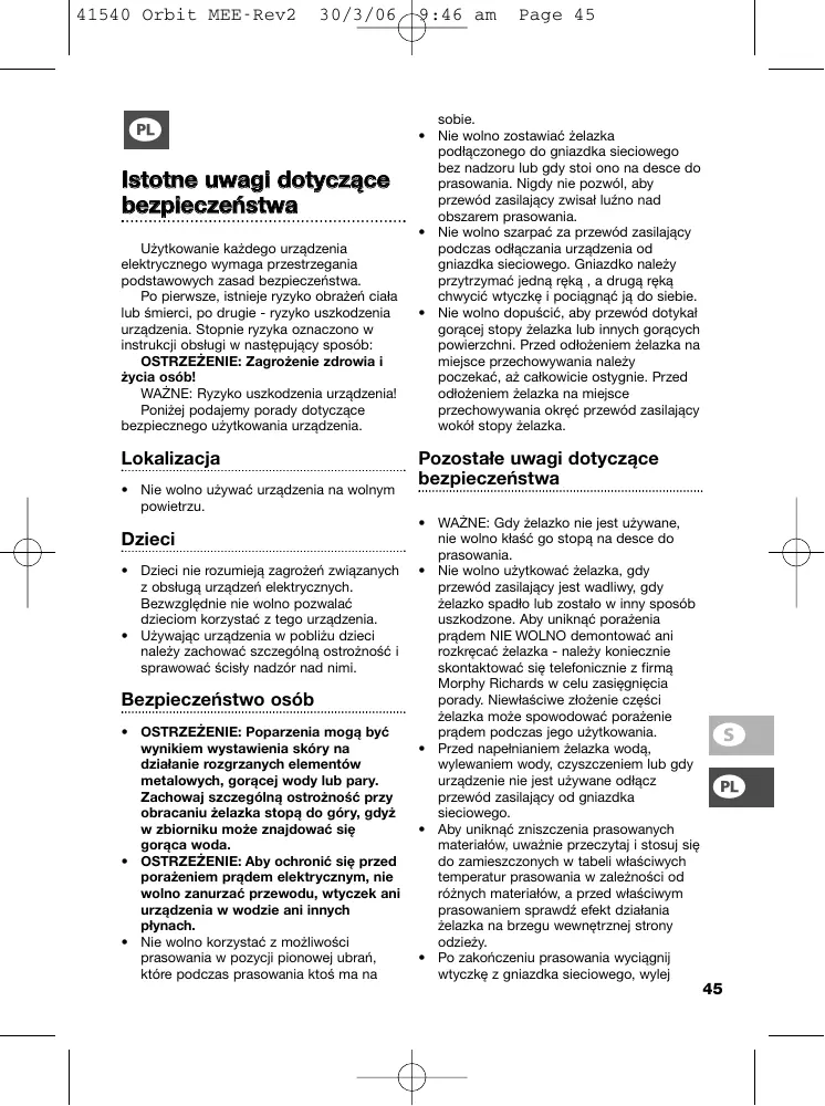 Bezpieczeństwo osób • OSTRZEŻENIE: Poparzenia mogą być wynikiem wystawienia skóry na działanie rozgrzanych elementów metalowych, gorącej wody lub pary. Zachowaj szczególną ostrożność przy obracaniu żelazka stopą do góry, gdyż w zbiorniku może znajdować się gorąca woda. • OSTRZEŻENIE: Aby ochronić się przed porażeniem prądem elektrycznym, nie wolno zanurzać przewodu, wtyczek ani urządzenia w wodzie ani innych płynach. • Nie wolno korzystać z możliwości prasowania w pozycji pionowej ubrań, które podczas prasowania ktoś ma na