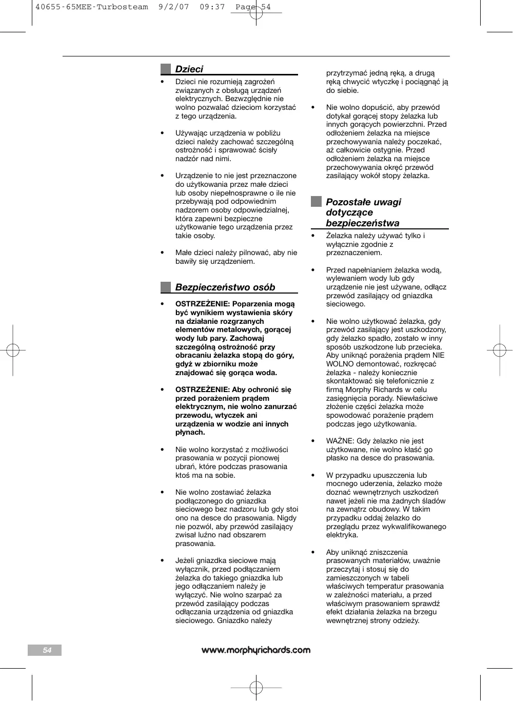 Nie wolno użytkować żelazka, gdy przewód zasilający jest uszkodzony, gdy żelazko spadło, zostało w inny sposób uszkodzone lub przecieka. Aby uniknąć porażenia prądem NIE WOLNO demontować, rozkręcać żelazka - należy koniecznie skontaktować się telefonicznie z firmą Morphy Richards w celu zasięgnięcia porady. Niewłaściwe złożenie części żelazka może spowodować porażenie prądem podczas jego użytkowania.