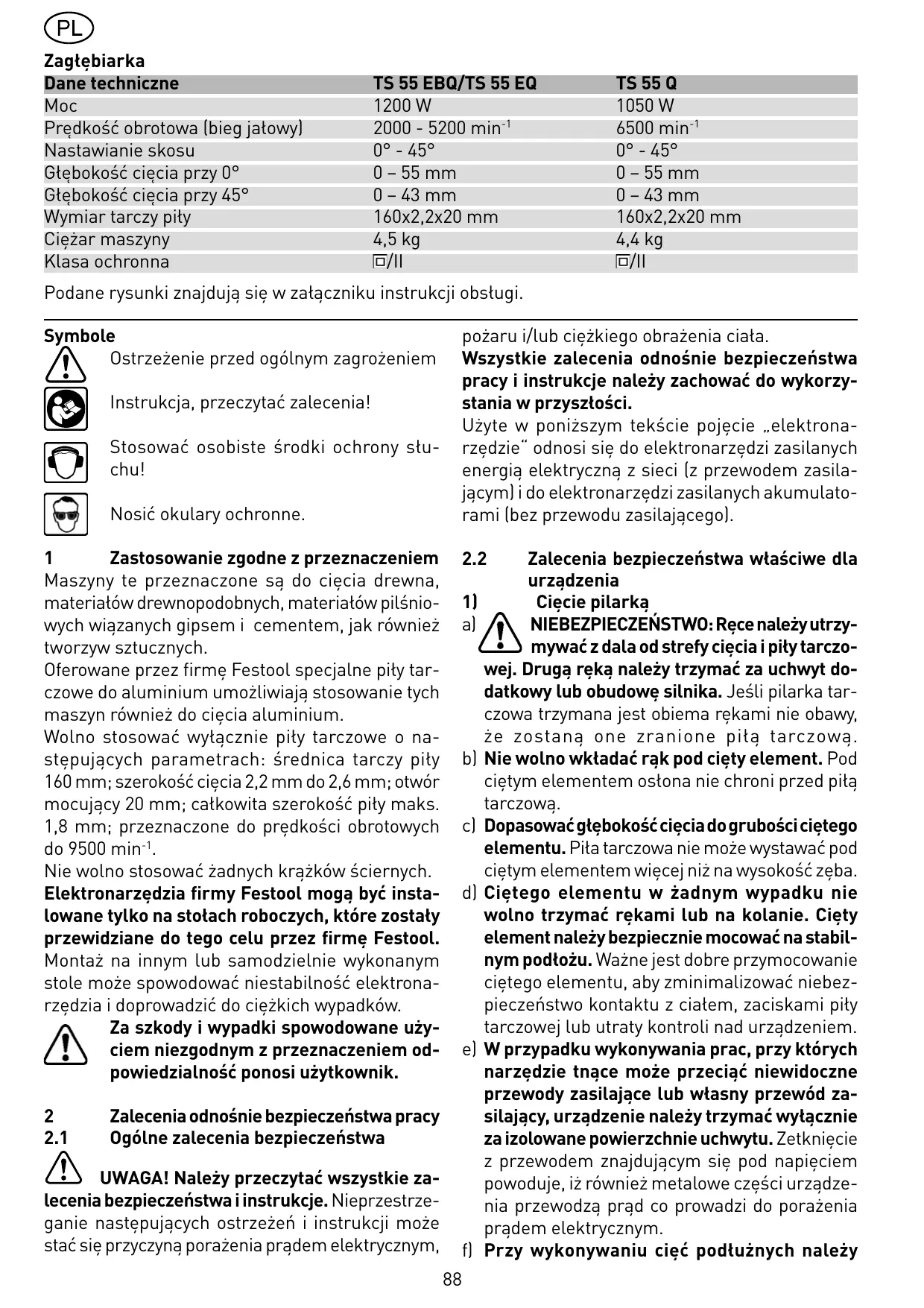 1200 W 2000 - 5200 min-1 0° - 45° 0 – 55 mm 0 – 43 mm 160x2,2x20 mm 4,5 kg /II TS 55 Q 1050 W 6500 min-1 0° - 45° 0 – 55 mm 0 – 43 mm 160x2,2x20 mm 4,4 kg /II Podane rysunki znajdują się w załączniku instrukcji obsługi. Symbole Ostrzeżenie przed ogólnym zagrożeniem Instrukcja, przeczytać zalecenia! Stosować osobiste środki ochrony słuchu! Nosić okulary ochronne. Zastosowanie zgodne z przeznaczeniem Maszyny te przeznaczone są do cięcia drewna, materiałów drewnopodobnych, materiałów pilśniowych wiązanych gipsem i cementem, jak również tworzyw sztucznych. Oferowane przez firmę Festool specjalne piły tarczowe do aluminium umożliwiają stosowanie tych maszyn również do cięcia aluminium. Wolno stosować wyłącznie piły tarczowe o następujących parametrach: średnica tarczy piły 160 mm; szerokość cięcia 2,2 mm do 2,6 mm; otwór mocujący 20 mm; całkowita szerokość piły maks. 1,8 mm; przeznaczone do prędkości obrotowych do 9500 min-1. Nie wolno stosować żadnych krążków ściernych. Elektronarzędzia firmy Festool mogą być instalowane tylko na stołach roboczych, które zostały przewidziane do tego celu przez firmę Festool. Montaż na innym lub samodzielnie wykonanym stole może spowodować niestabilność elektronarzędzia i doprowadzić do ciężkich wypadków. Za szkody i wypadki spowodowane użyciem niezgodnym z przeznaczeniem odpowiedzialność ponosi użytkownik.