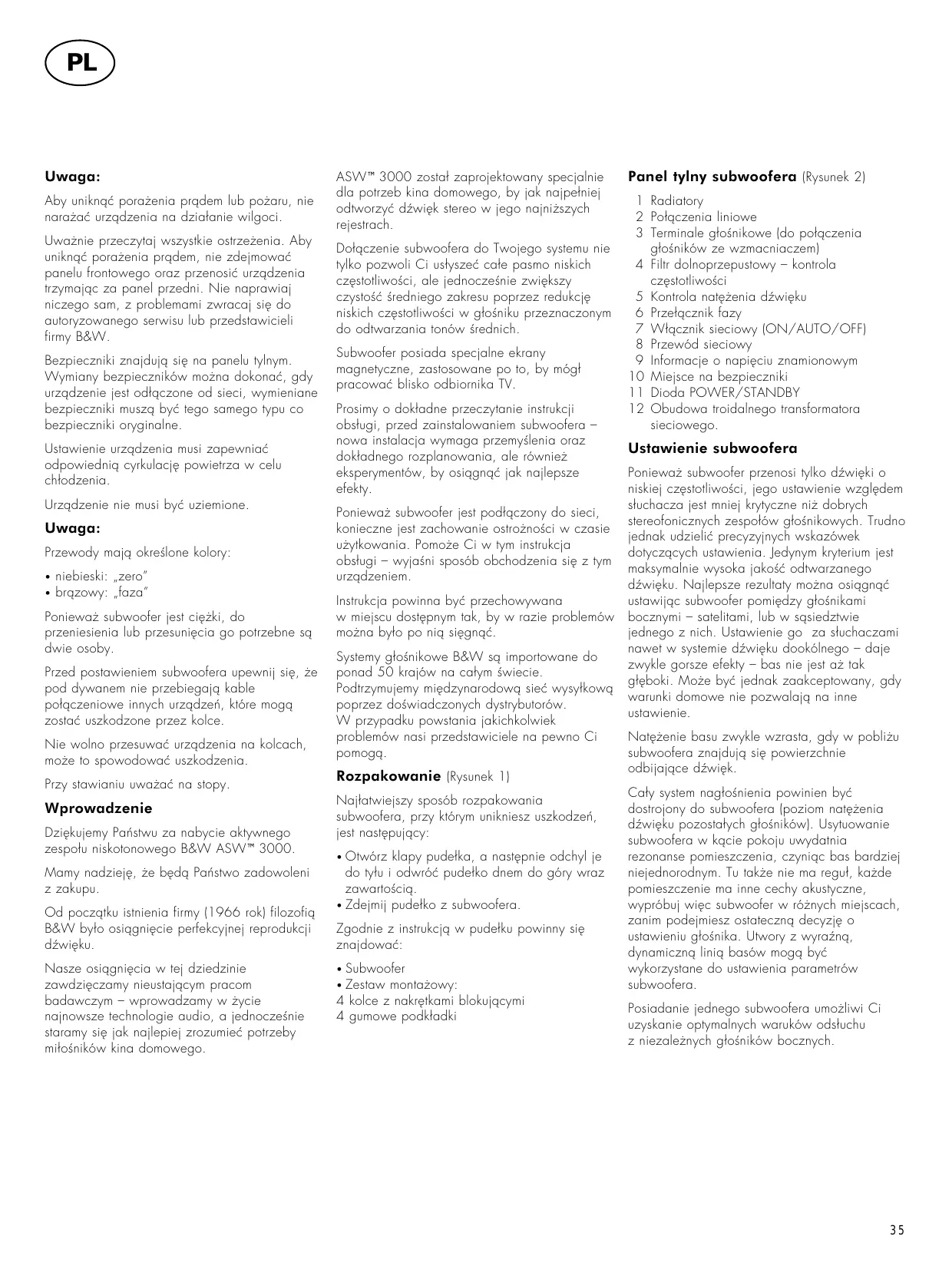 ASW™3000 zosta¡ zaprojektowany specjalnie dla potrzeb kina domowego, by jak najpe¡niej odtworzyπ dØwi∆k stereo w jego najniÃszych rejestrach. Do¡ƒczenie subwoofera do Twojego systemu nie tylko pozwoli Ci us¡yszeπ ca¡e pasmo niskich cz∆stotliwo·ci, ale jednocze·nie zwi∆kszy czysto·π ·redniego zakresu poprzez redukcj∆ niskich cz∆stotliwo·ci w g¡o·niku przeznaczonym do odtwarzania tonów ·rednich. Subwoofer posiada specjalne ekrany magnetyczne, zastosowane po to, by móg¡ pracowaπ blisko odbiornika TV. Prosimy o dok¡adne przeczytanie instrukcji obs¡ugi, przed zainstalowaniem subwoofera – nowa instalacja wymaga przemy·lenia oraz dok¡adnego rozplanowania, ale równieà eksperymentów, by osiƒgnƒπ jak najlepsze efekty. Poniewaà subwoofer jest pod¡ƒczony do sieci, konieczne jest zachowanie ostroÃno·ci w czasie uÃytkowania. PomoÃe Ci w tym instrukcja obs¡ugi – wyja·ni sposób obchodzenia si∆ z tym urzƒdzeniem. Instrukcja powinna byπ przechowywana w miejscu dost∆pnym tak, by w razie problemów moÃna by¡o po niƒ si∆gnƒπ. Systemy g¡o·nikowe B&W sƒ importowane do ponad 50 krajów na ca¡ym ·wiecie. Podtrzymujemy mi∆dzynarodowƒ sieπ wysy¡kowƒ poprzez do·wiadczonych dystrybutorów. W przypadku powstania jakichkolwiek problemów nasi przedstawiciele na pewno Ci pomogƒ.