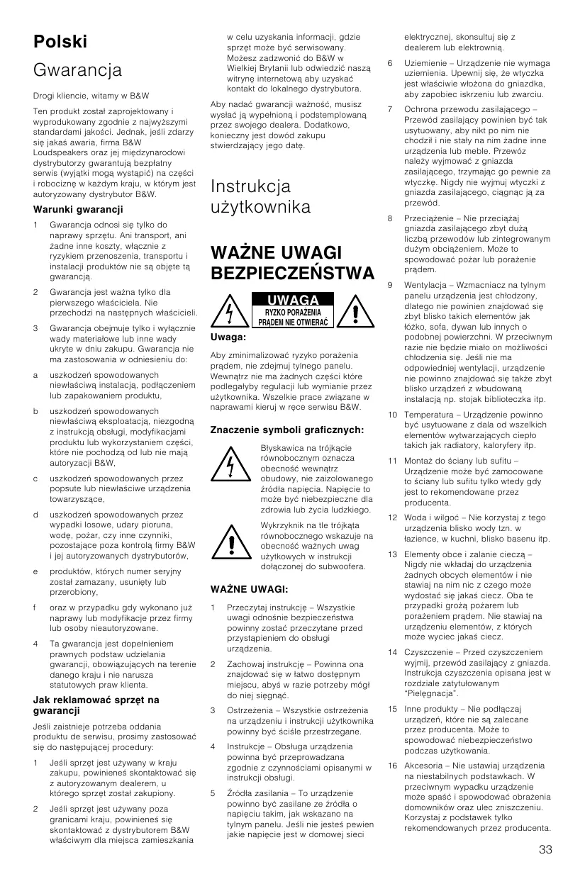 Uwaga: Aby zminimalizowaπ ryzyko poraÃenia prƒdem, nie zdejmuj tylnego panelu. Wewnƒtrz nie ma Ãadnych cz∆·ci które podlega¡yby regulacji lub wymianie przez uÃytkownika. Wszelkie prace zwiƒzane w naprawami kieruj w r∆ce serwisu B&W. Znaczenie symboli graficznych: B¡yskawica na trójkƒcie równobocznym oznacza obecno·π wewnƒtrz obudowy, nie zaizolowanego Øród¡a napi∆cia. Napi∆cie to moÃe byπ niebezpieczne dla zdrowia lub Ãycia ludzkiego. Wykrzyknik na tle trójkƒta równobocznego wskazuje na obecno·π waÃnych uwag uÃytkowych w instrukcji do¡ƒczonej do subwoofera. WA…NE UWAGI: