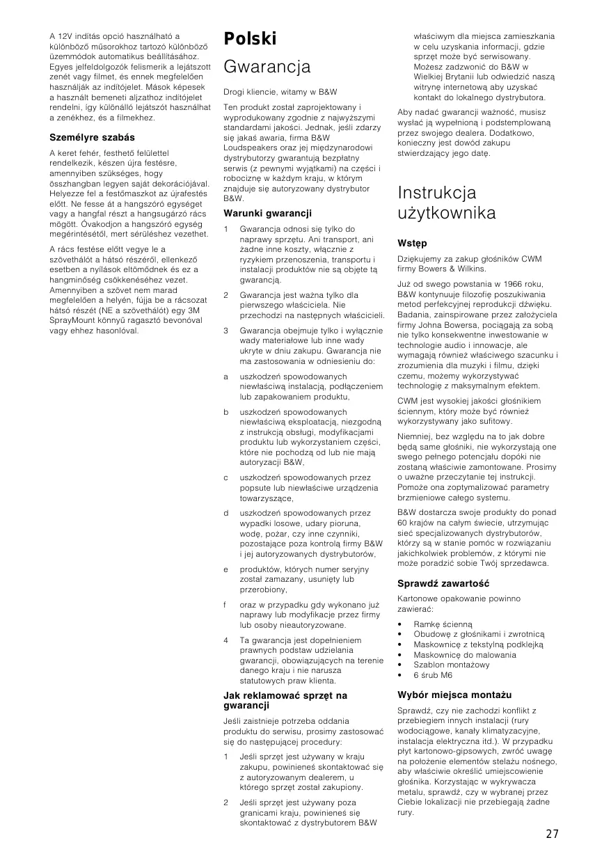 Instrukcja uÃytkownika Wst∆p Dzi∆kujemy za zakup g¡o·ników CWM firmy Bowers & Wilkins. Juà od swego powstania w 1966 roku, B&W kontynuuje filozofi∆ poszukiwania metod perfekcyjnej reprodukcji dØwi∆ku. Badania, zainspirowane przez za¡oÃyciela firmy Johna Bowersa, pociƒgajƒ za sobƒ nie tylko konsekwentne inwestowanie w technologie audio i innowacje, ale wymagajƒ równieà w¡a·ciwego szacunku i zrozumienia dla muzyki i filmu, dzi∆ki czemu, moÃemy wykorzystywaπ technologi∆ z maksymalnym efektem. CWM jest wysokiej jako·ci g¡o·nikiem ·ciennym, który moÃe byπ równieà wykorzystywany jako sufitowy. Niemniej, bez wzgl∆du na to jak dobre b∆dƒ same g¡o·niki, nie wykorzystajƒ one swego pe¡nego potencja¡u dopóki nie zostanƒ w¡a·ciwie zamontowane. Prosimy o uwaÃne przeczytanie tej instrukcji. PomoÃe ona zoptymalizowaπ parametry brzmieniowe ca¡ego systemu. B&W dostarcza swoje produkty do ponad 60 krajów na ca¡ym ·wiecie, utrzymujƒc sieπ specjalizowanych dystrybutorów, którzy sƒ w stanie pomóc w rozwiƒzaniu jakichkolwiek problemów, z którymi nie moÃe poradziπ sobie Twój sprzedawca.