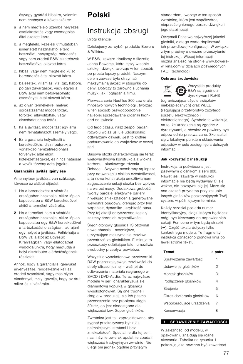 standardom, tworzƒc w ten sposób zwrotnic∆, która jest wspó¡twórcƒ nieprze·cignionego obrazu dØwi∆ku i jego stabilno·ci. Otrzymali Pa◊stwo najwyÃszej jako·ci g¡o·niki, dlatego warto dopilnowaπ ich prawid¡owej konfiguracji. W zwiƒzku z tym prosimy o uwaÃne przeczytanie tej instrukcji. Wi∆cej informacji moÃna znaleØπ na stronie www.bowerswilkins.com w dzia¡ach po·wi∆conych FAQ i technologii. Ochrona ·rodowiska Wszystkie produkty B&W sƒ zgodne z dyrektywami RoHS (ograniczajƒcƒ uÃycie zwiƒzków niebezpiecznych) oraz WEEE (regulujƒcƒ przetwórstwo zuÃytego sprz∆tu elektrycznego i elektronicznego). Symbole te wskazujƒ na to, Ãe urzƒdzenia sƒ zgodne z dyrektywami, a równieà Ãe powinny byπ odpowiednio przetwarzane. Skonsultuj si∆ z lokalnym punktem sk¡adowania odpadów w celu zasi∆gni∆cia dalszych informacji. Jak korzystaπ z instrukcji Instrukcja ta po·wi∆cona jest pasywnym g¡o·nikom z serii 800. Nawet je·li zawarte w instrukcji informacje nie b∆dƒ wydawa¡y Ci si∆ waÃne, nie pozbywaj si∆ jej. MoÃe si∆ ona okazaπ przydatna przy zakupie innych g¡o·ników poszerzajƒcych Twój system, w póØniejszym terminie. KaÃdy rozdzia¡ posiada numer identyfikacyjny, dzi∆ki którym b∆dziesz móg¡ byπ kierowany do odpowiednich sekcji. Pomocne w tym b∆dƒ strza¡ki (f). Cz∆·π tekstu dotyczy tylko konkretnego modelu. Te fragmenty instrukcji oznaczono pionowƒ liniƒ po lewej stronie tekstu. Temat