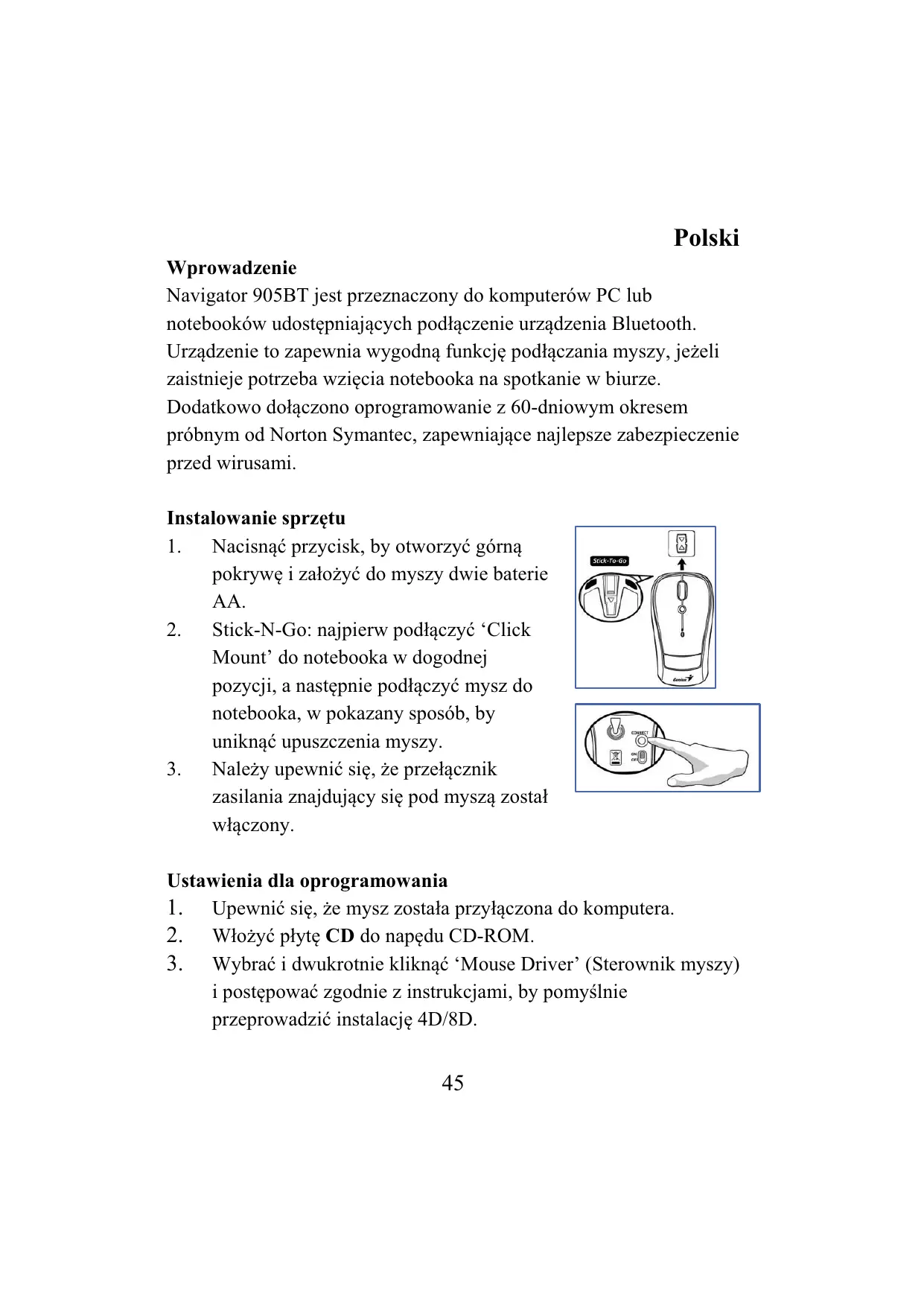 Polski Wprowadzenie Navigator 905BT jest przeznaczony do komputerów PC lub notebooków udostĊpniających podáączenie urządzenia Bluetooth. Urządzenie to zapewnia wygodną funkcjĊ podáączania myszy, jeĪeli zaistnieje potrzeba wziĊcia notebooka na spotkanie w biurze. Dodatkowo doáączono oprogramowanie z 60-dniowym okresem próbnym od Norton Symantec, zapewniające najlepsze zabezpieczenie przed wirusami. Instalowanie sprzĊtu Nacisnąü przycisk, by otworzyü górną pokrywĊ i zaáoĪyü do myszy dwie baterie AA. Stick-N-Go: najpierw podáączyü ‘Click Mount’ do notebooka w dogodnej pozycji, a nastĊpnie podáączyü mysz do notebooka, w pokazany sposób, by uniknąü upuszczenia myszy. NaleĪy upewniü siĊ, Īe przeáącznik zasilania znajdujący siĊ pod myszą zostaá wáączony. Ustawienia dla oprogramowania