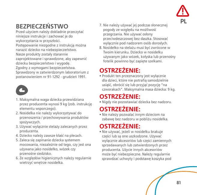 BEZPIECZEŃSTWO Przed użyciem należy dokładnie przeczytać niniejsze instrukcje i zachować je do wykorzystania w przyszłości. Postępowanie niezgodne z instrukcją można narazić dziecko na niebezpieczeństwo. Nasze produkty zostały starannie zaprojektowane i sprawdzone, aby zapewnić dziecku bezpieczeństwo i wygodę. Zgodny z wymogami bezpieczeństwa. Sprawdzony w zatwierdzonym laboratorium z postanowieniem nr 91-1292 - grudzień 1991.