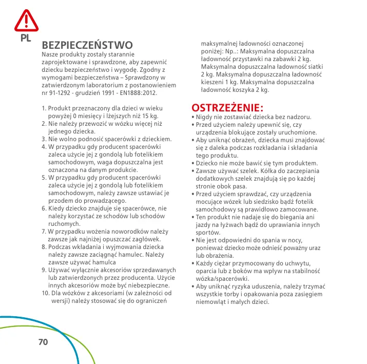PL BEZPIECZEŃSTWO Nasze produkty zostały starannie zaprojektowane i sprawdzone, aby zapewnić dziecku bezpieczeństwo i wygodę. Zgodny z wymogami bezpieczeństwa – Sprawdzony w zatwierdzonym laboratorium z postanowieniem nr 91-1292 - grudzień 1991 - EN1888:2012. 1. P rodukt przeznaczony dla dzieci w wieku powyżej 0 miesięcy i lżejszych niż 15 kg. 2. N ie należy przewozić w wózku więcej niż jednego dziecka. 3. Nie wolno podnosić spacerówki z dzieckiem. 4. W przypadku gdy producent spacerówki zaleca użycie jej z gondolą lub fotelikiem samochodowym, waga dopuszczalna jest oznaczona na danym produkcie. 5. W przypadku gdy producent spacerówki zaleca użycie jej z gondolą lub fotelikiem samochodowym, należy zawsze ustawiać je przodem do prowadzącego. 6. Kiedy dziecko znajduje się spacerówce, nie należy korzystać ze schodów lub schodów ruchomych. 7. W przypadku wożenia noworodków należy zawsze jak najniżej opuszczać zagłówek. 8. Podczas wkładania i wyjmowania dziecka należy zawsze zaciągnąć hamulec. Należy zawsze używać hamulca 9. U żywać wyłącznie akcesoriów sprzedawanych lub zatwierdzonych przez producenta. Użycie innych akcesoriów może być niebezpieczne. 10. D la wózków z akcesoriami (w zależności od wersji) należy stosować się do ograniczeń