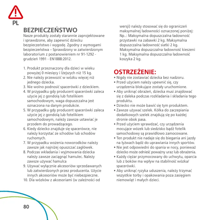 PL BEZPIECZEŃSTWO Nasze produkty zostały starannie zaprojektowane i sprawdzone, aby zapewnić dziecku bezpieczeństwo i wygodę. Zgodny z wymogami bezpieczeństwa – Sprawdzony w zatwierdzonym laboratorium z postanowieniem nr 91-1292 grudzień 1991 - EN1888:2012. 1. Produkt przeznaczony dla dzieci w wieku powyżej 0 miesięcy i lżejszych niż 15 kg. 2. Nie należy przewozić w wózku więcej niż jednego dziecka. 3. Nie wolno podnosić spacerówki z dzieckiem. 4. W przypadku gdy producent spacerówki zaleca użycie jej z gondolą lub fotelikiem samochodowym, waga dopuszczalna jest oznaczona na danym produkcie. 5. W przypadku gdy producent spacerówki zaleca użycie jej z gondolą lub fotelikiem samochodowym, należy zawsze ustawiać je przodem do prowadzącego. 6. Kiedy dziecko znajduje się spacerówce, nie należy korzystać ze schodów lub schodów ruchomych. 7. W przypadku wożenia noworodków należy zawsze jak najniżej opuszczać zagłówek. 8. Podczas wkładania i wyjmowania dziecka należy zawsze zaciągnąć hamulec. Należy zawsze używać hamulca 9. Używać wyłącznie akcesoriów sprzedawanych lub zatwierdzonych przez producenta. Użycie innych akcesoriów może być niebezpieczne. 10. Dla wózków z akcesoriami (w zależności od