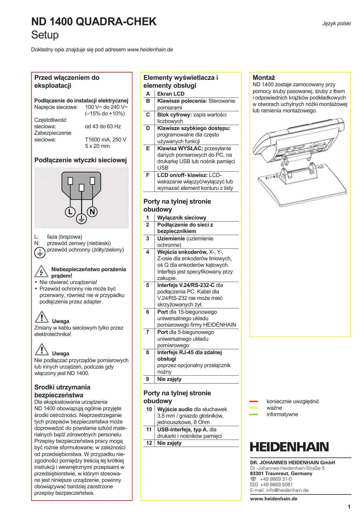 - Premir a tecla ENVIAR para comunicar resultados. ND 1400 QUADRA-CHEK Setup Język polski Dokładny opis znajduje się pod adresem www.heidenhain.de Przed włączeniem do eksploatacji Podłączenie do instalacji elektrycznej Napięcie sieciowe: 100 V~ do 240 V~ (–15% do +10%) Częstotliwość sieciowa: od 43 do 63 Hz Zabezpieczenie sieciowe: T1600 mA, 250 V 5 x 20 mm Elementy wyświetlacza i elementy obsługi
