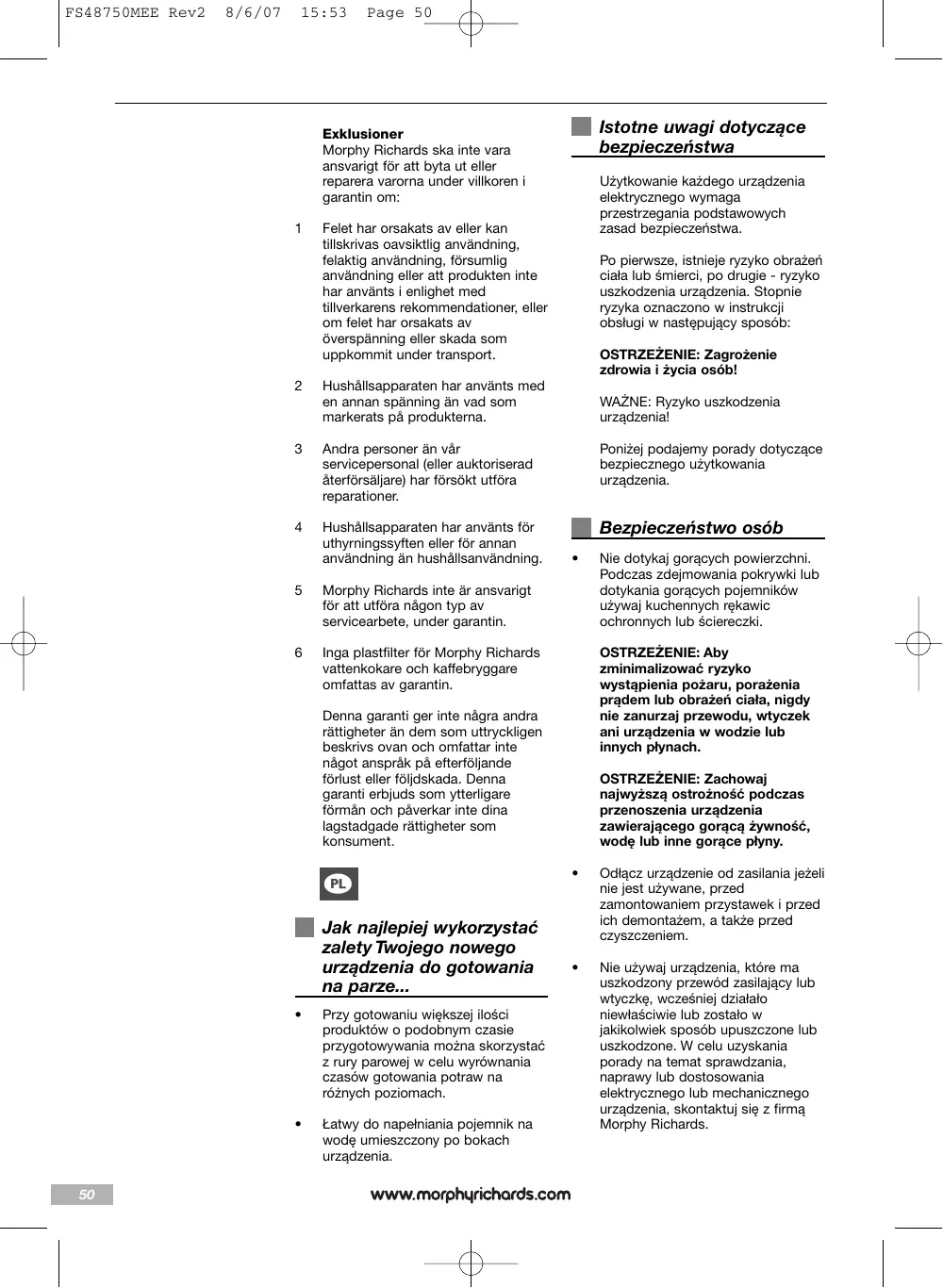 Jeśli z jakiegoś powodu urządzenie zostanie wymienione w ciągu 2 lat gwarancji, gwarancja nowego urządzenia będzie liczona od momentu nabycia oryginalnego produktu. Dlatego też należy zachować oryginalny paragon lub fakturę z umieszczoną datą zakupu urządzenia. Aby dwuletnia gwarancja obowiązywała, urządzenie musi być użytkowane zgodnie z instrukcją eksploatacji wydaną przez producenta. Na przykład niektóre urządzenia muszą być regularnie odkamieniane, a filtry należy utrzymywać w czystości według zaleceń producenta. Morphy Richards nie dokona naprawy ani wymiany urządzenia w ramach gwarancji jeśli: