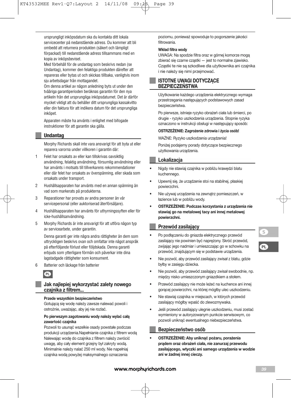 Firma Morphy Richards nie wykonuje żadnych czynności serwisowych w ramach niniejszej gwarancji.