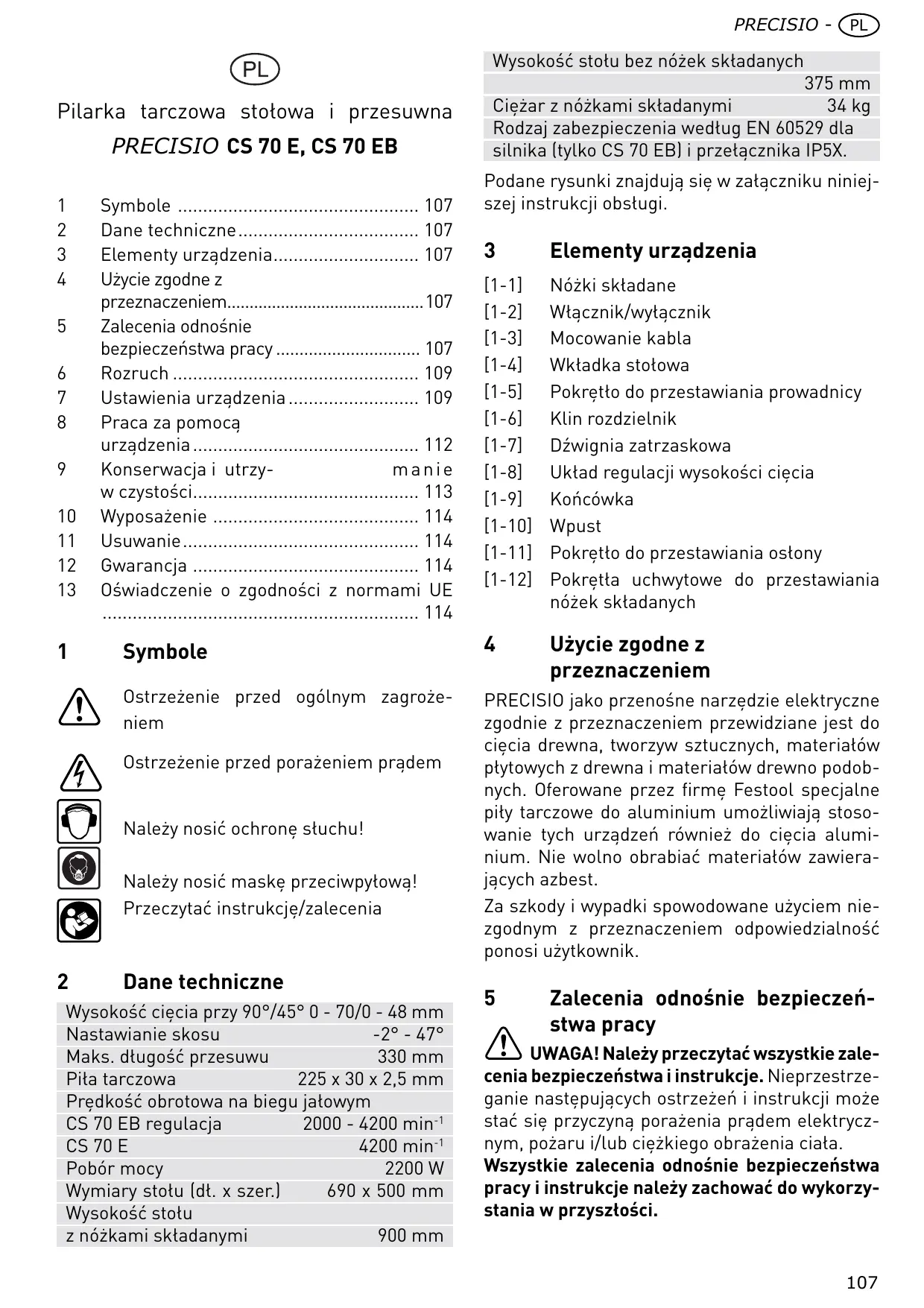 Użycie zgodne z przeznaczeniem Ostrzeżenie przed ogólnym zagrożeniem PRECISIO jako przenośne narzędzie elektryczne zgodnie z przeznaczeniem przewidziane jest do cięcia drewna, tworzyw sztucznych, materiałów płytowych z drewna i materiałów drewno podobnych. Oferowane przez firmę Festool specjalne piły tarczowe do aluminium umożliwiają stosowanie tych urządzeń również do cięcia aluminium. Nie wolno obrabiać materiałów zawierających azbest. Za szkody i wypadki spowodowane użyciem niezgodnym z przeznaczeniem odpowiedzialność ponosi użytkownik. Ostrzeżenie przed porażeniem prądem Należy nosić ochronę słuchu! Należy nosić maskę przeciwpyłową! Przeczytać instrukcję/zalecenia