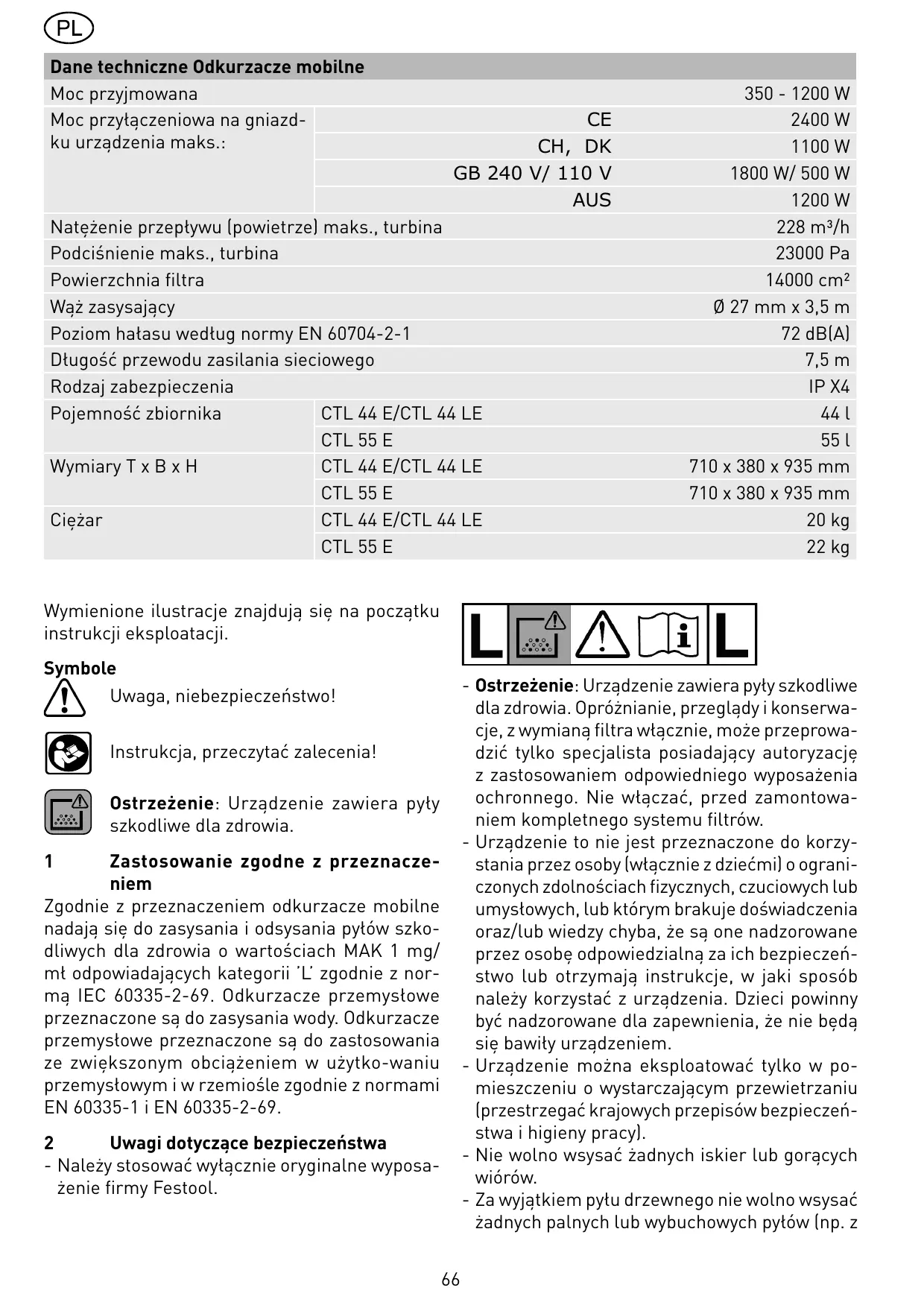 Zastosowanie zgodne z przeznaczeniem Zgodnie z przeznaczeniem odkurzacze mobilne nadają się do zasysania i odsysania pyłów szkodliwych dla zdrowia o wartościach MAK 1 mg/ mł odpowiadających kategorii ’L’ zgodnie z normą IEC 60335-2-69. Odkurzacze przemysłowe przeznaczone są do zasysania wody. Odkurzacze przemysłowe przeznaczone są do zastosowania ze zwiększonym obciążeniem w użytko-waniu przemysłowym i w rzemiośle zgodnie z normami EN 60335-1 i EN 60335-2-69. Uwagi dotyczące bezpieczeństwa - Należy stosować wyłącznie oryginalne wyposażenie firmy Festool.