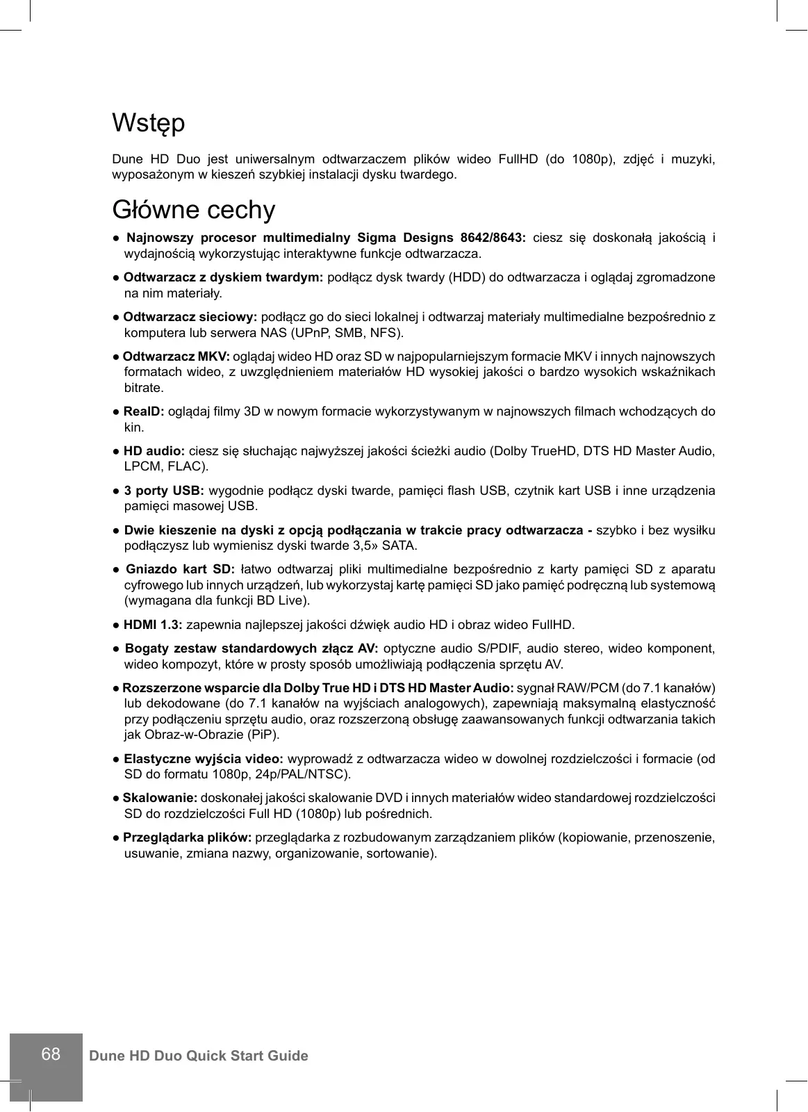 Wstęp Dune HD Duo jest uniwersalnym odtwarzaczem plików wideo FullHD (do 1080p), zdjęć i muzyki, wyposażonym w kieszeń szybkiej instalacji dysku twardego. Główne cechy ● Najnowszy procesor multimedialny Sigma Designs 8642/8643: ciesz się doskonałą jakością i wydajnością wykorzystując interaktywne funkcje odtwarzacza. ● Odtwarzacz z dyskiem twardym: podłącz dysk twardy (HDD) do odtwarzacza i oglądaj zgromadzone na nim materiały. ● Odtwarzacz sieciowy: podłącz go do sieci lokalnej i odtwarzaj materiały multimedialne bezpośrednio z komputera lub serwera NAS (UPnP, SMB, NFS). ● Odtwarzacz MKV: oglądaj wideo HD oraz SD w najpopularniejszym formacie MKV i innych najnowszych formatach wideo, z uwzględnieniem materiałów HD wysokiej jakości o bardzo wysokich wskaźnikach bitrate. ● RealD: oglądaj filmy 3D w nowym formacie wykorzystywanym w najnowszych filmach wchodzących do kin. ● HD audio: ciesz się słuchając najwyższej jakości ścieżki audio (Dolby TrueHD, DTS HD Master Audio, LPCM, FLAC). ● 3 porty USB: wygodnie podłącz dyski twarde, pamięci flash USB, czytnik kart USB i inne urządzenia pamięci masowej USB. ● Dwie kieszenie na dyski z opcją podłączania w trakcie pracy odtwarzacza - szybko i bez wysiłku podłączysz lub wymienisz dyski twarde 3,5» SATA. ● Gniazdo kart SD: łatwo odtwarzaj pliki multimedialne bezpośrednio z karty pamięci SD z aparatu cyfrowego lub innych urządzeń, lub wykorzystaj kartę pamięci SD jako pamięć podręczną lub systemową (wymagana dla funkcji BD Live). ● HDMI 1.3: zapewnia najlepszej jakości dźwięk audio HD i obraz wideo FullHD. ● Bogaty zestaw standardowych złącz AV: optyczne audio S/PDIF, audio stereo, wideo komponent, wideo kompozyt, które w prosty sposób umożliwiają podłączenia sprzętu AV. ● Rozszerzone wsparcie dla Dolby True HD i DTS HD Master Audio: sygnał RAW/PCM (do 7.1 kanałów) lub dekodowane (do 7.1 kanałów na wyjściach analogowych), zapewniają maksymalną elastyczność przy podłączeniu sprzętu audio, oraz rozszerzoną obsługę zaawansowanych funkcji odtwarzania takich jak Obraz-w-Obrazie (PiP). ● Elastyczne wyjścia video: wyprowadź z odtwarzacza wideo w dowolnej rozdzielczości i formacie (od SD do formatu 1080p, 24p/PAL/NTSC). ● Skalowanie: doskonałej jakości skalowanie DVD i innych materiałów wideo standardowej rozdzielczości SD do rozdzielczości Full HD (1080p) lub pośrednich. ● Przeglądarka plików: przeglądarka z rozbudowanym zarządzaniem plików (kopiowanie, przenoszenie, usuwanie, zmiana nazwy, organizowanie, sortowanie).