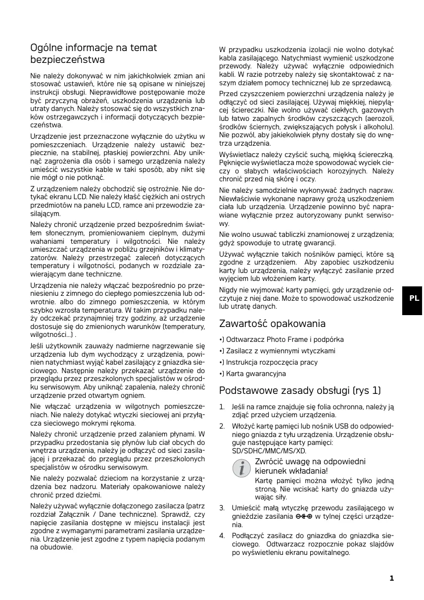 Nigdy nie wyjmować karty pamięci, gdy urzadzenia odczytuje znej dane. Może to spowodstaw uszkodzenia lub utrata danchy.