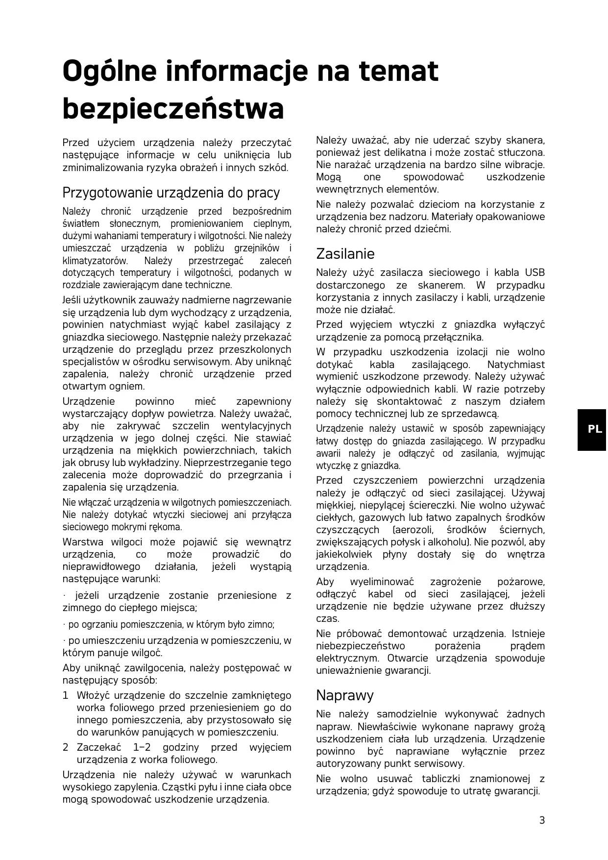 - po umieszczeniu urządzenia w pomieszczeniu, w którym panuje wilgoć. Aby uniknąć zawilgocenia, należy postępować w następujący sposób: 1 Włożyć urządzenie do szczelnie zamkniętego worka foliowego przed przeniesieniem go do innego pomieszczenia, aby przystosowało się do warunków panujących w pomieszczeniu. 2 Zaczekać 1–2 godziny przed urządzenia z worka foliowego. Urządzenia nie należy używać w warunkach wysokiego zapylenia. wyjęciem Urządzenia nie należy używać w warunkach wysokiego zapylenia. Cząstki pyłu i inne ciała obce mogą spowodować uszkodzenie urządzenia. Należy uważać, aby nie uderzać szyby skanera, ponieważ jest delikatna i może zostać stłuczona. Nie narażać urządzenia na bardzo silne wibracje. Mogą one spowodować uszkodzenie wewnętrznych elementów. Nie należy pozwalać dzieciom na korzystanie z urządzenia bez nadzoru. Nie należy pozwalać dzieciom na korzystanie z urządzenia bez nadzoru. Materiały opakowaniowe należy chronić przed dziećmi. Zasilanie Należy użyć zasilacza sieciowego i kabla USB dostarczonego ze skanerem. Należy użyć zasilacza sieciowego i kabla USB dostarczonego ze skanerem. W przypadku korzystania z innych zasilaczy i kabli, urządzenie może nie działać. Przełącznik ogólny Przed wyjęciem wtyczki z gniazdka wyłączyć urządzenie za pomocą przełącznika. W przypadku uszkodzenia izolacji nie wolno dotykać kabla zasilającego. W przypadku uszkodzenia izolacji nie wolno dotykać kabla zasilającego. Natychmiast wymienić uszkodzone przewody. Należy używać wyłącznie odpowiednich kabli. W razie potrzeby należy się skontaktować z naszym działem pomocy technicznej lub ze sprzedawcą. Urządzenie należy ustawić w sposób zapewniający łatwy dostęp do gniazda zasilającego. Urządzenie należy ustawić w sposób zapewniający łatwy dostęp do gniazda zasilającego. W przypadku awarii należy je odłączyć od zasilania, wyjmując wtyczkę z gniazdka. Przed czyszczeniem powierzchni urządzenia należy je odłączyć od sieci zasilającej. Przed czyszczeniem powierzchni urządzenia należy je odłączyć od sieci zasilającej. Używaj miękkiej, niepylącej ściereczki. Nie wolno używać ciekłych, gazowych lub łatwo zapalnych środków czyszczących (aerozoli, środków ściernych, zwiększających połysk i alkoholu). Nie pozwól, aby jakiekolwiek płyny dostały się do wnętrza urządzenia. Aby wyeliminować zagrożenie pożarowe, odłączyć kabel od sieci zasilającej, jeżeli urządzenie nie będzie używane przez dłuższy czas. Aby wyeliminować zagrożenie pożarowe, odłączyć kabel od sieci zasilającej, jeżeli urządzenie nie będzie używane przez dłuższy czas. Nie próbować demontować urządzenia. Istnieje niebezpieczeństwo porażenia prądem elektrycznym. Otwarcie urządzenia spowoduje unieważnienie gwarancji. Naprawy Naprawy Nie należy samodzielnie wykonywać żadnych napraw. Niewłaściwie wykonane naprawy grożą uszkodzeniem ciała lub urządzenia. Urządzenie powinno być naprawiane wyłącznie przez autoryzowany punkt serwisowy. Nie wolno usuwać tabliczki znamionowej z urządzenia; gdyż spowoduje to utratę gwarancji.